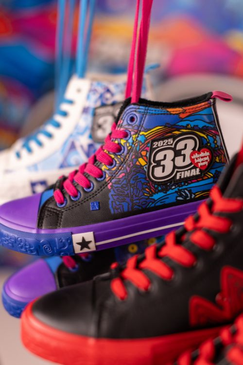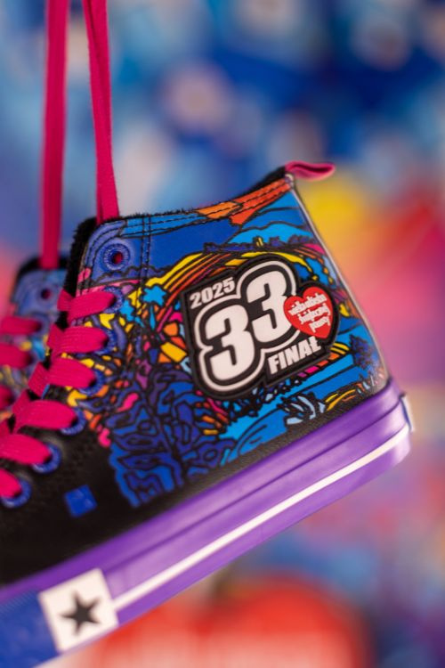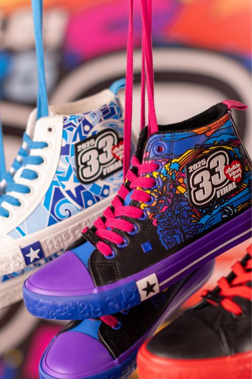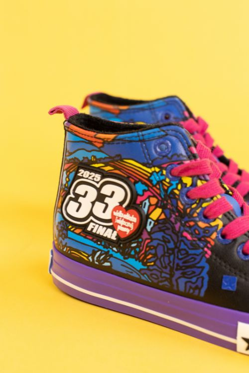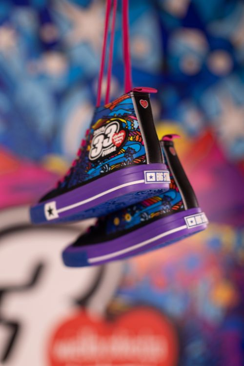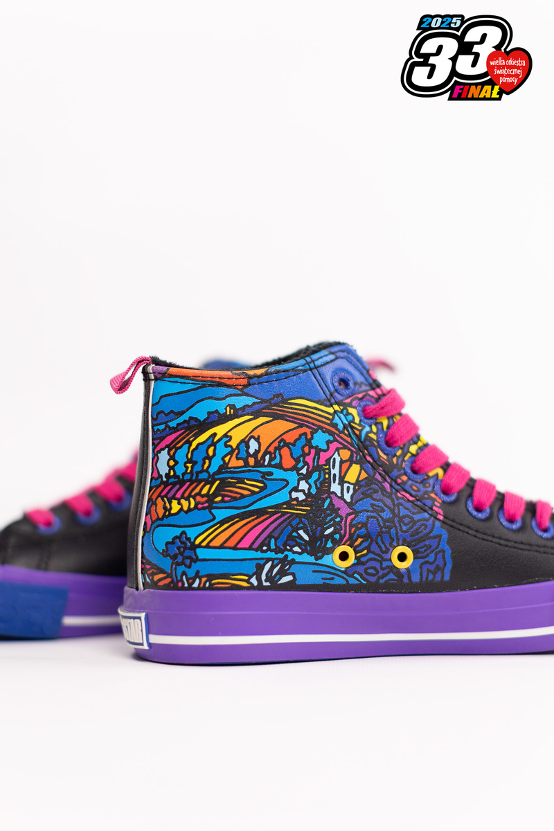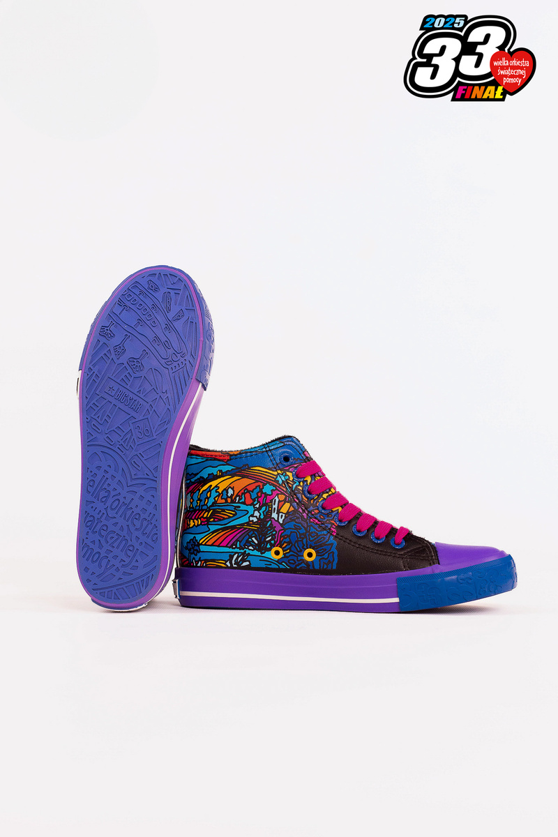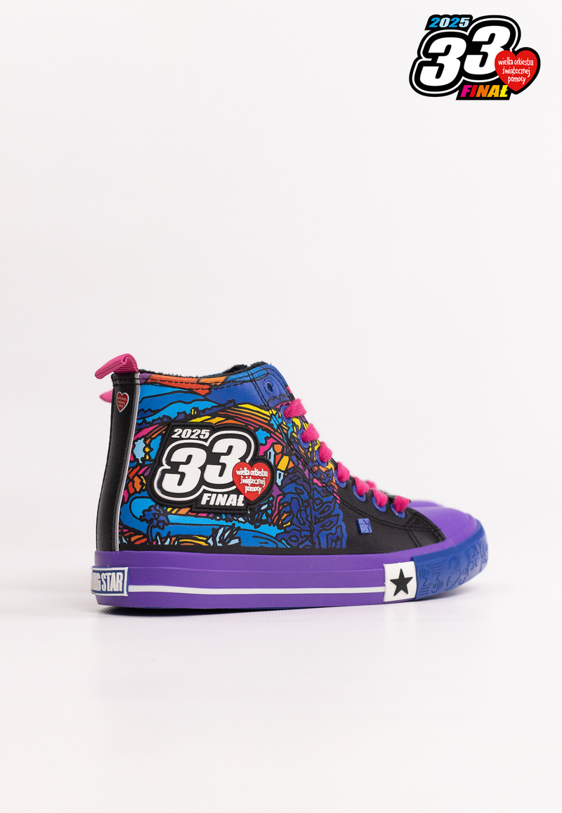 To najbardziej kolorowy i wyrazisty model z całej kolekcji, który został zaprojektowany przez zespół grafików Jurka Owsiaka. Trampki doskonale oddają radosnego ducha akcji WOŚP. Różowe sznurowadła w połączeniu z fioletowo niebieskimi podeszwami sprawiają, że buty odznaczają się niepowtarzanym, energetycznym wyglądem. Przód buta jest ozdobiony charakterystycznym sercem Wielkiej Orkiestry Świątecznej Pomocy, a zewnętrzna strona – dużym logo 33. Finału WOŚP.Wygoda