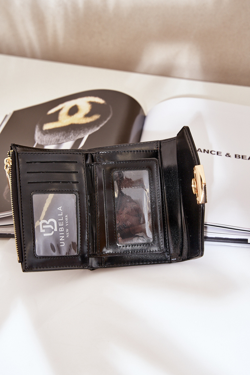 Portfel damski wykonany z lakierowanej eko skóry. Model ten posiada kieszeń na monety zamykaną na suwak. Wewnątrz znajduje się sekcja na banknoty oraz karty. Zapinany jest na magnes. Klasyczny fason, który z pewnością przypadnie do gustu każdej kobiecie!