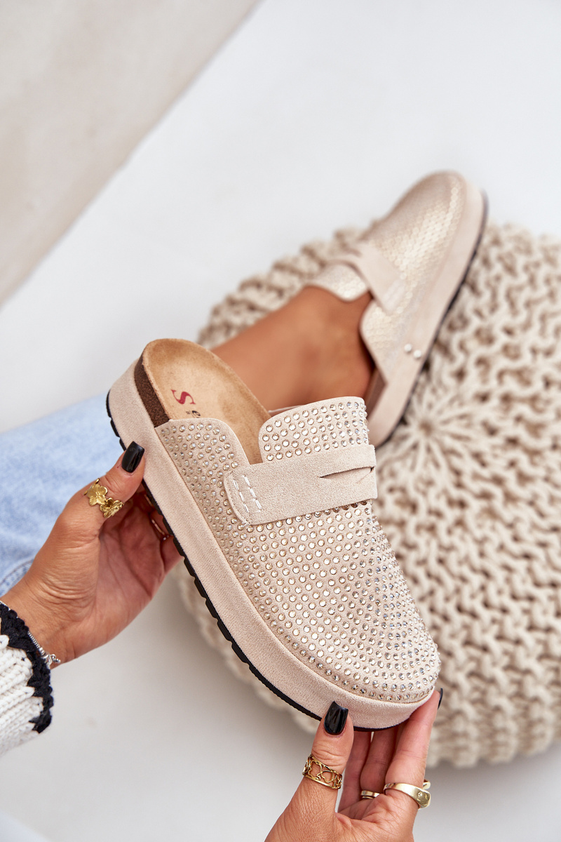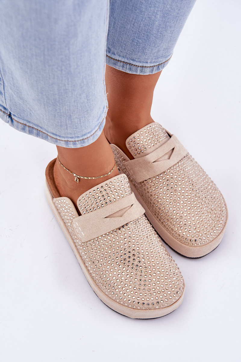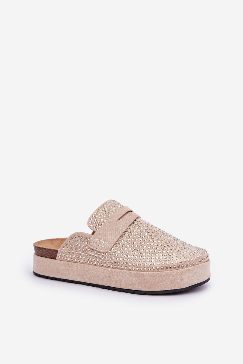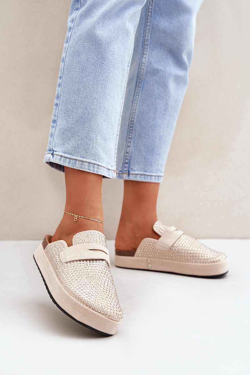 Klapki Damskie Zdobione Cyrkoniami Na Platformie Beżowe Deorani