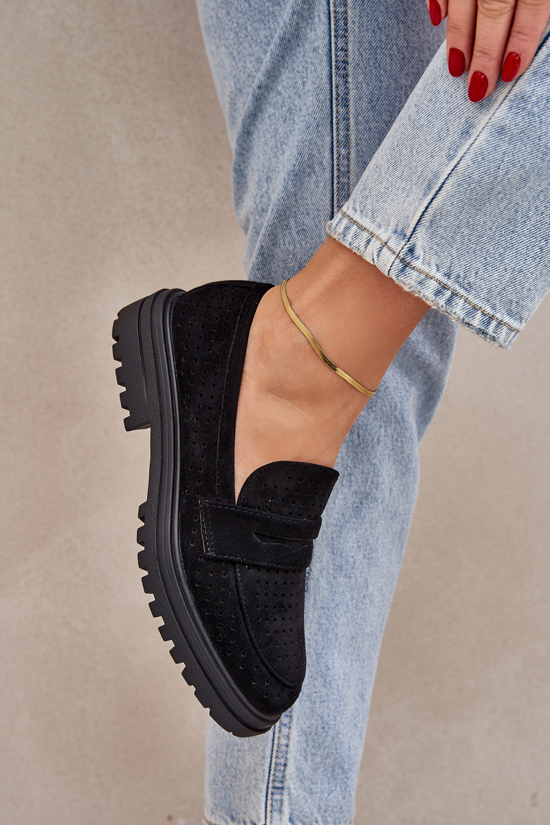 Damskie mokasyny z eko zamszu. Osadzone na płaskim obcasie, co zapewnia wygodę przez cały dzień. Zaokrąglone noski nadają im klasyczny wygląd. Ten model jest nie tylko stylowy, ale również funkcjonalny dzięki ażurowej cholewce, która umożliwia stopie oddychanie. Mokasyny te doskonale pasują zarówno do codziennych, jak i eleganckich zestawień! Przy wyborze rozmiaru prosimy sugerować się tabelą rozmiarów.