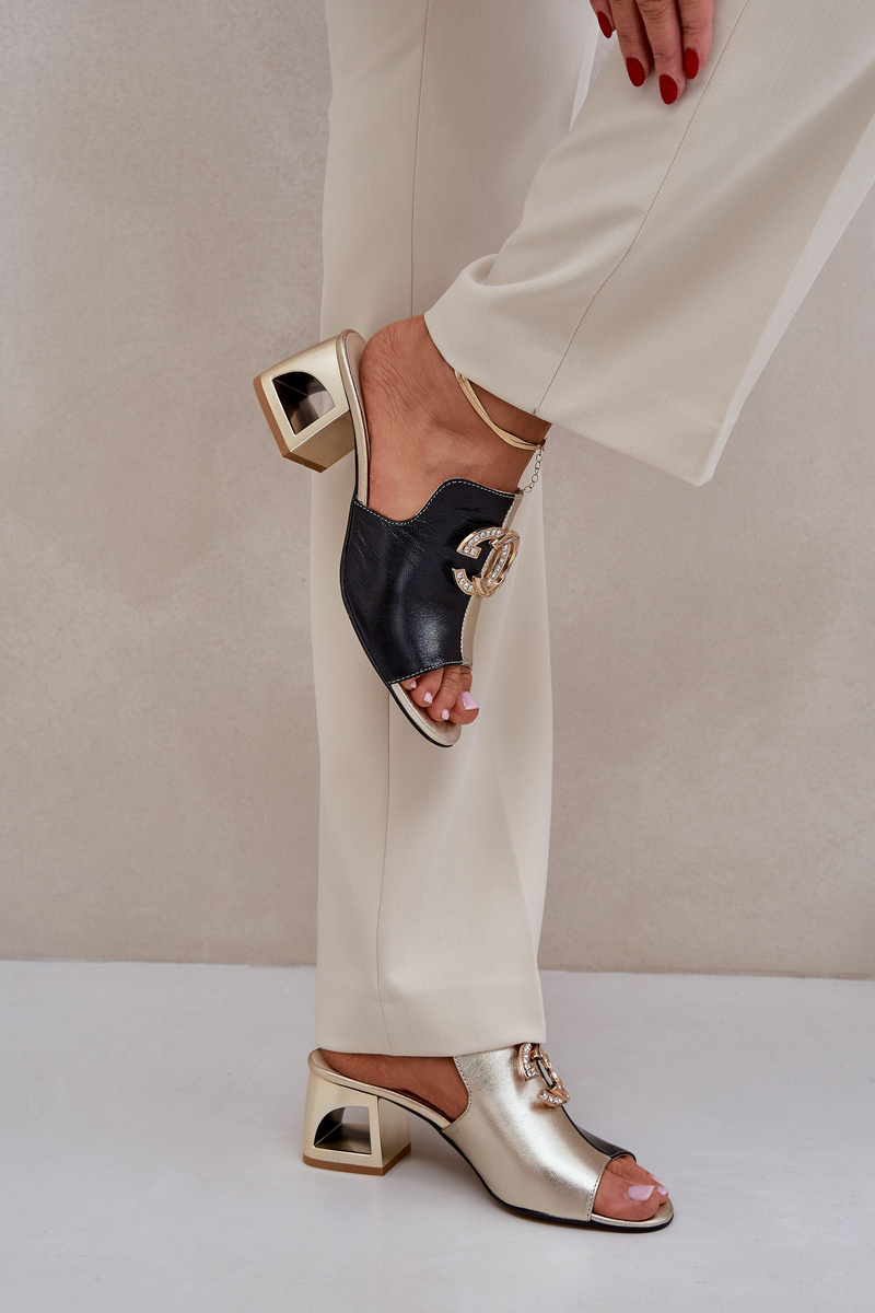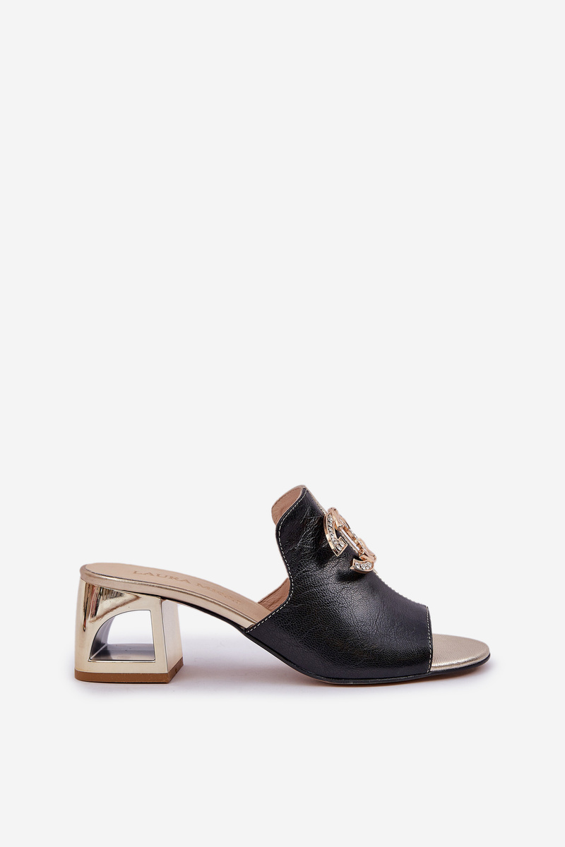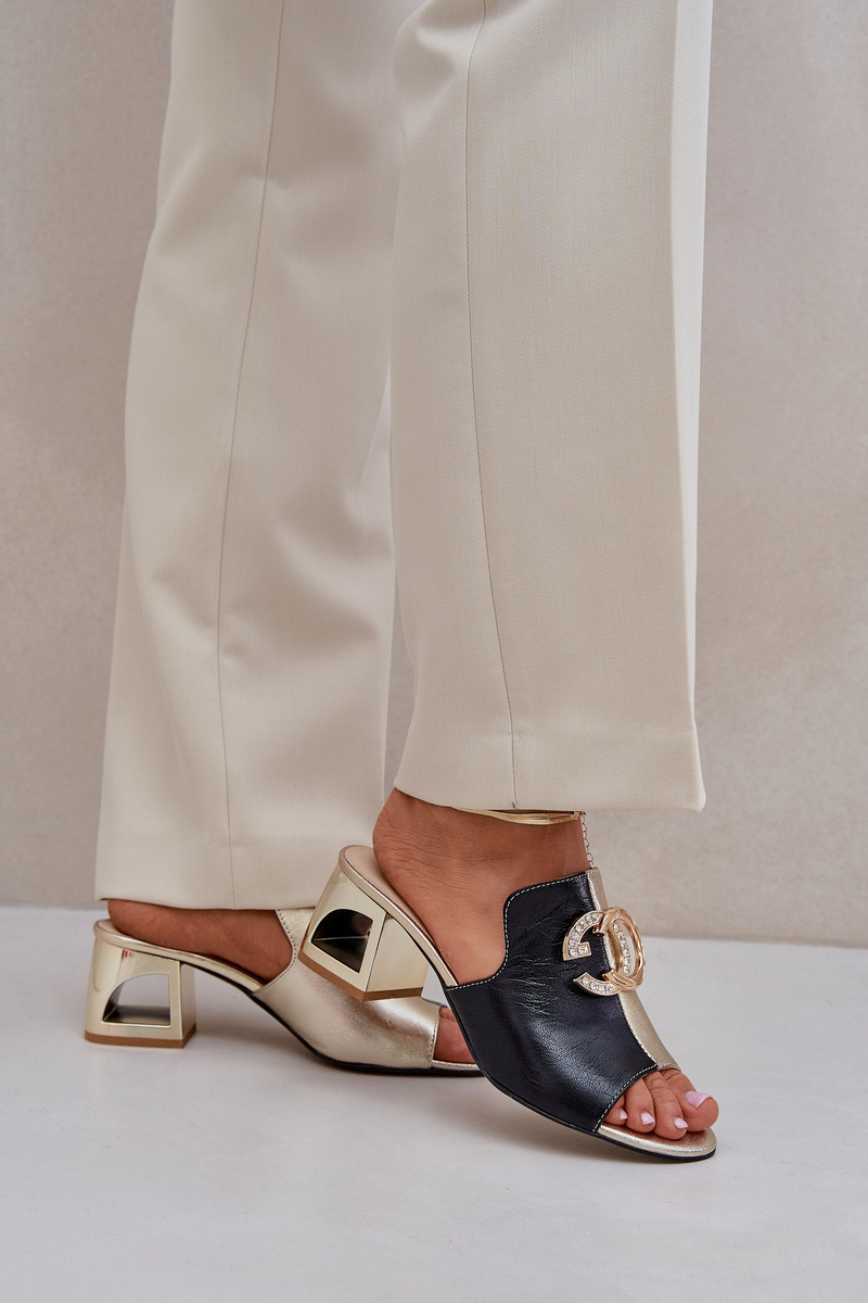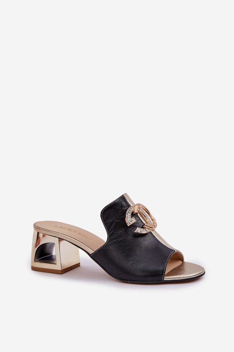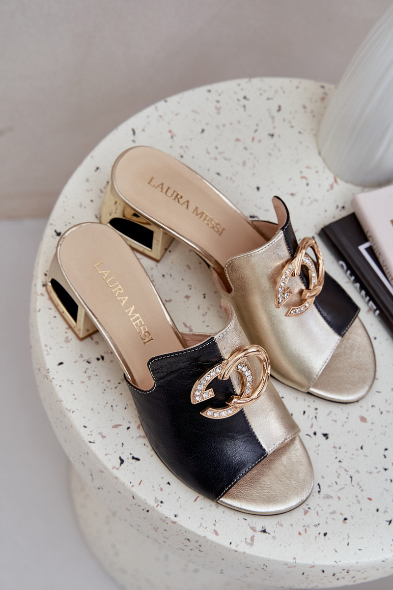 Eleganckie Skórzane Klapki Na Obcasie Laura Messi 2875 Czarno-Złote