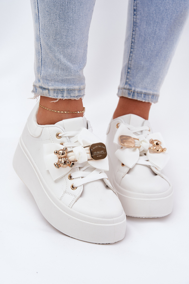 Sneakersy Damskie Z Kokardką I Broszką Z Misiem Białe Leathria