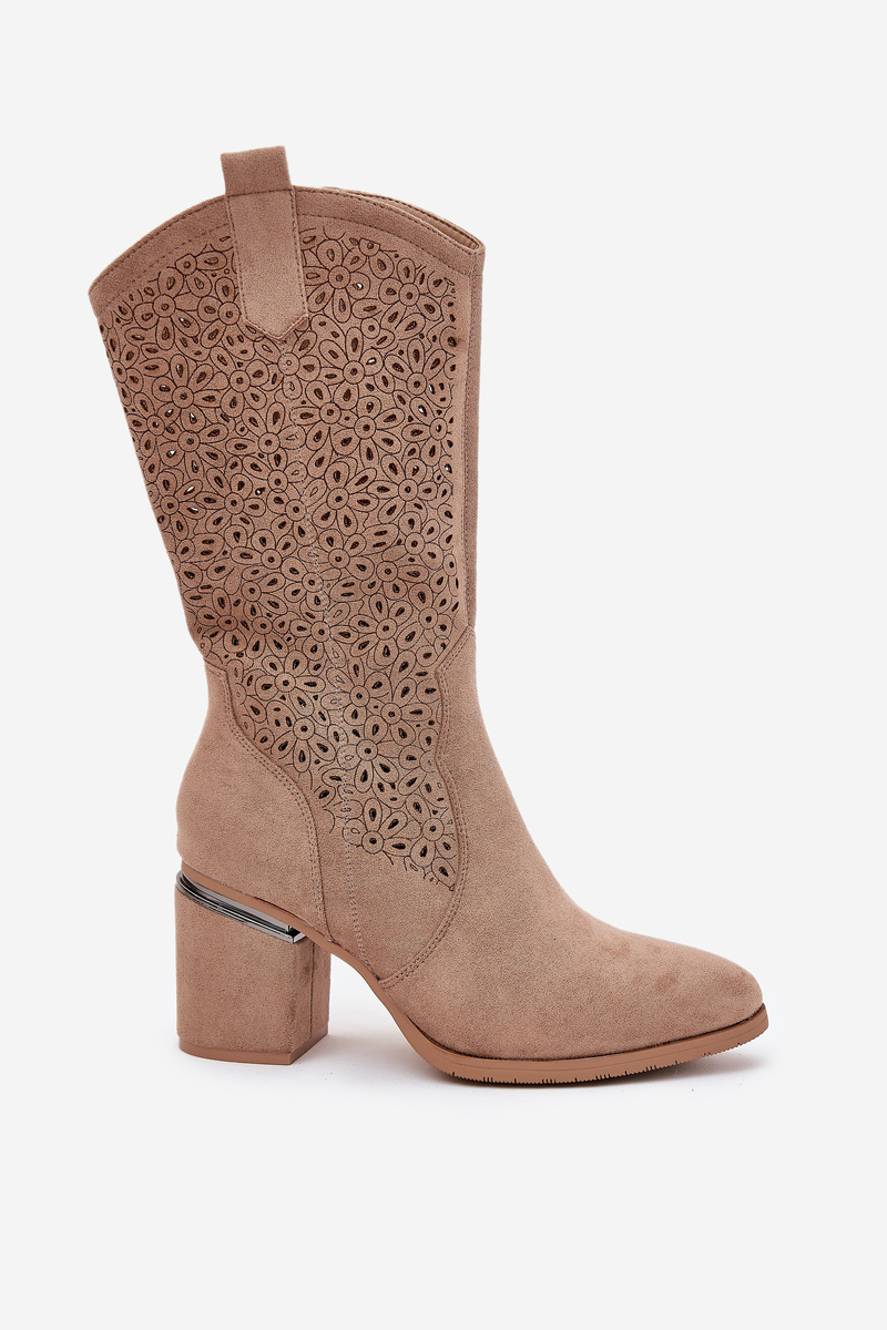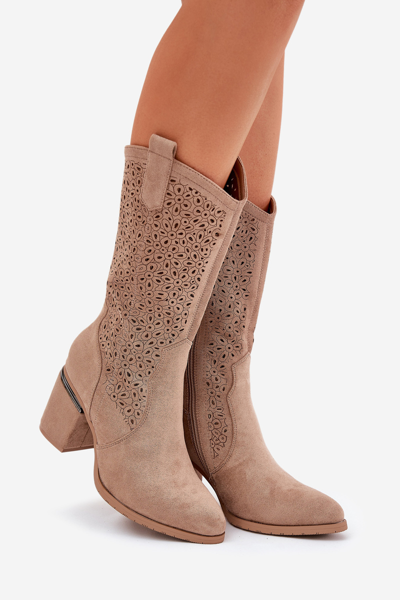 Ażurowe Kozaki Kowbojki Do Połowy Łydki S.Barski HY51-238 Beżowe