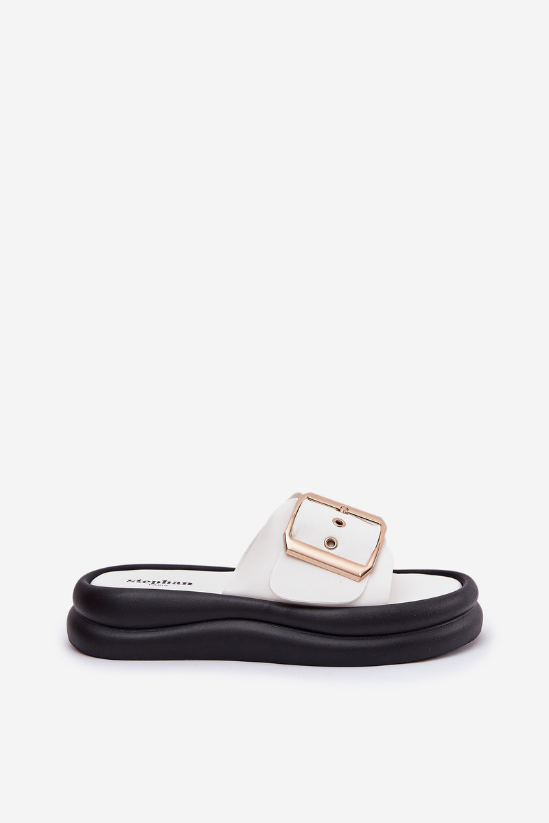 Klapki Damskie Na Masywnej Platformie Z Ozdobną Klamrą Białe Zelori
