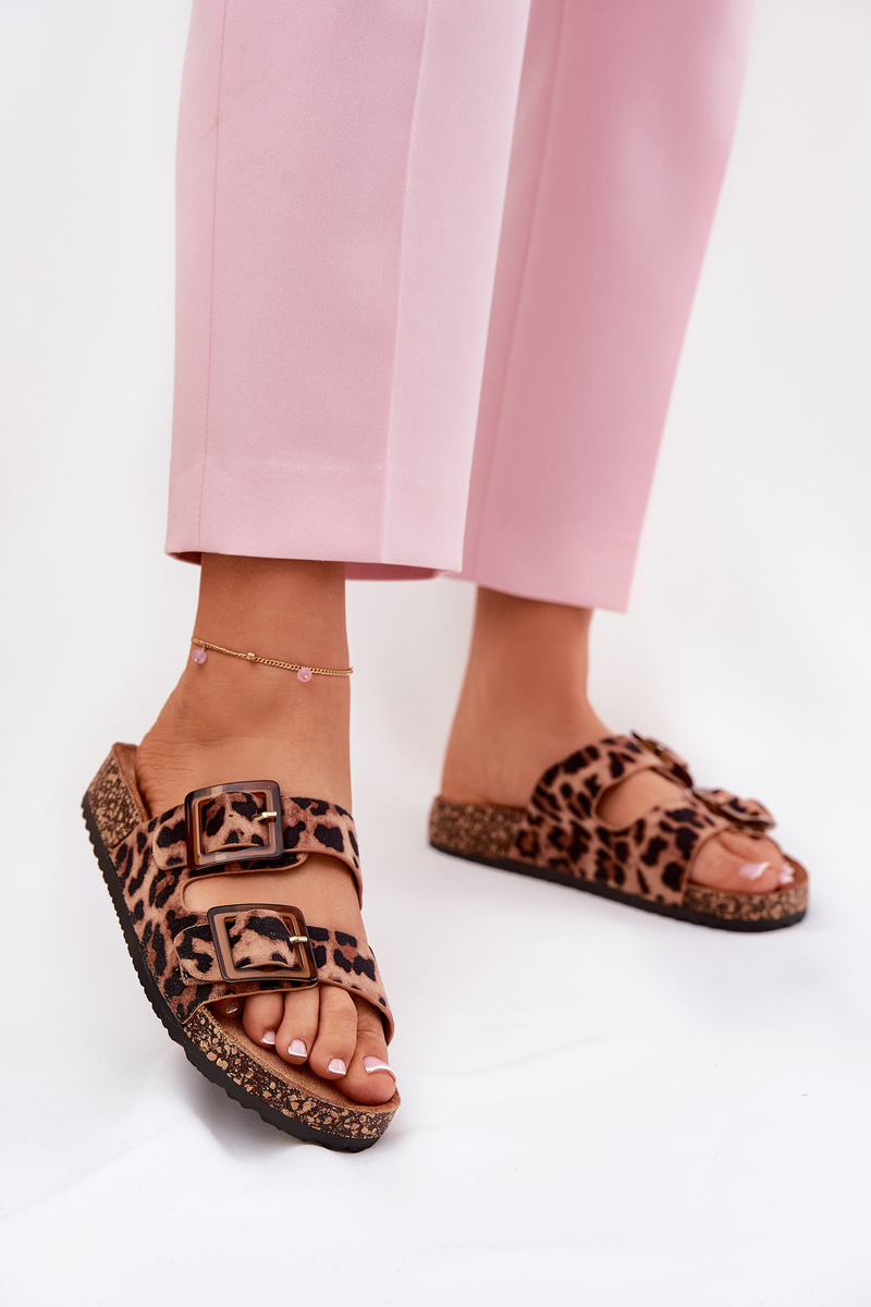 Klapki Damskie Z Klamrami Na Korkowej Podeszwie Panterka Brązowe Sercele