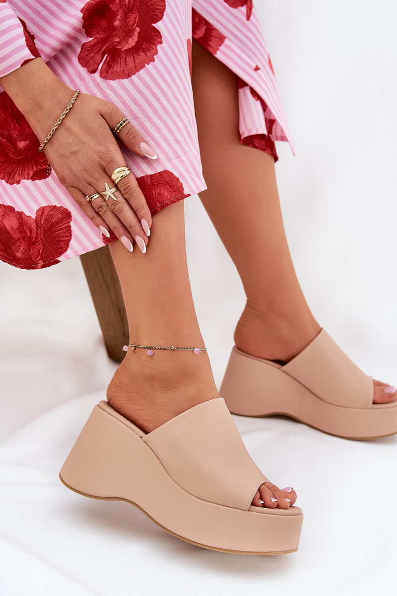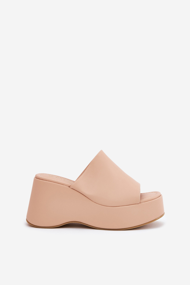 Eko Skórzane Klapki Damskie Na Platformie I Koturnie Beżowe Kisoffi
