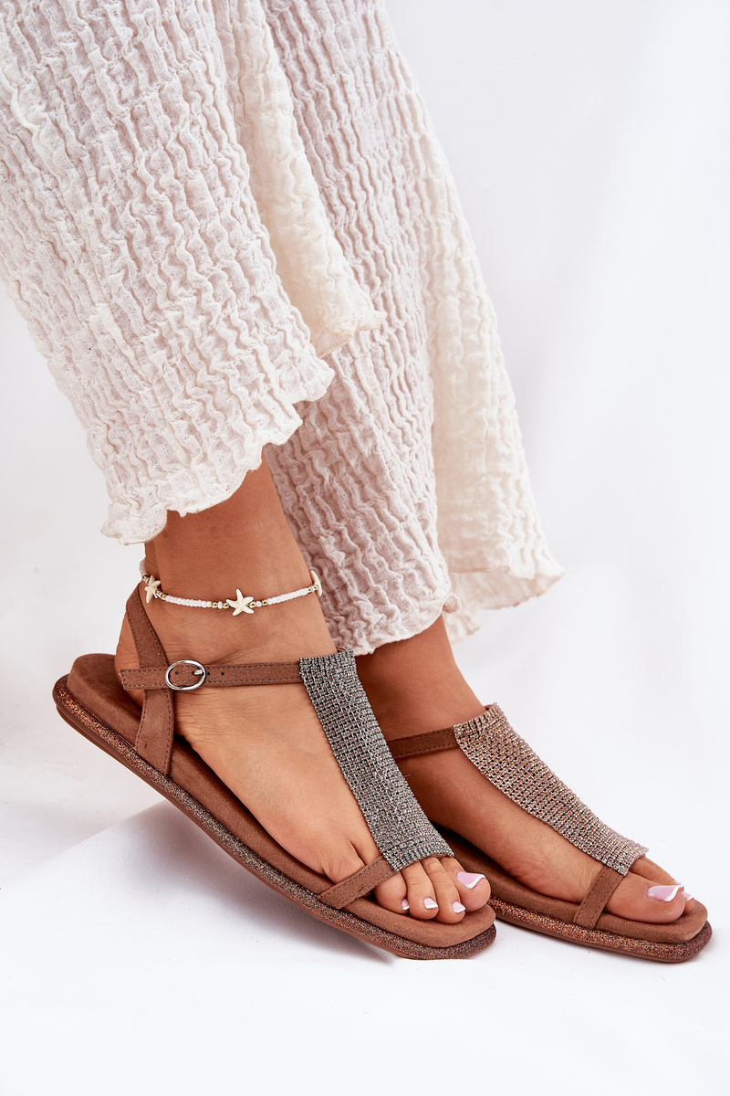 Płaskie Eleganckie Sandały Damskie Z Kryształkami Artiker 56C1365 Brązowe