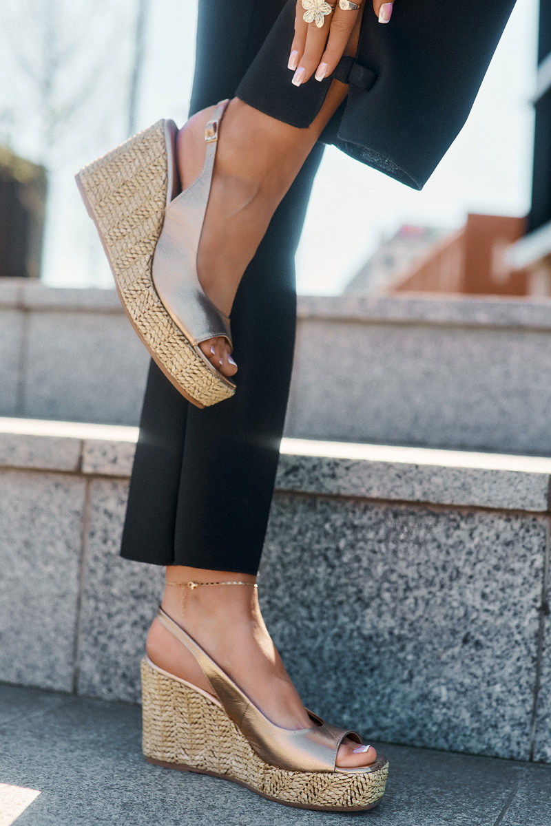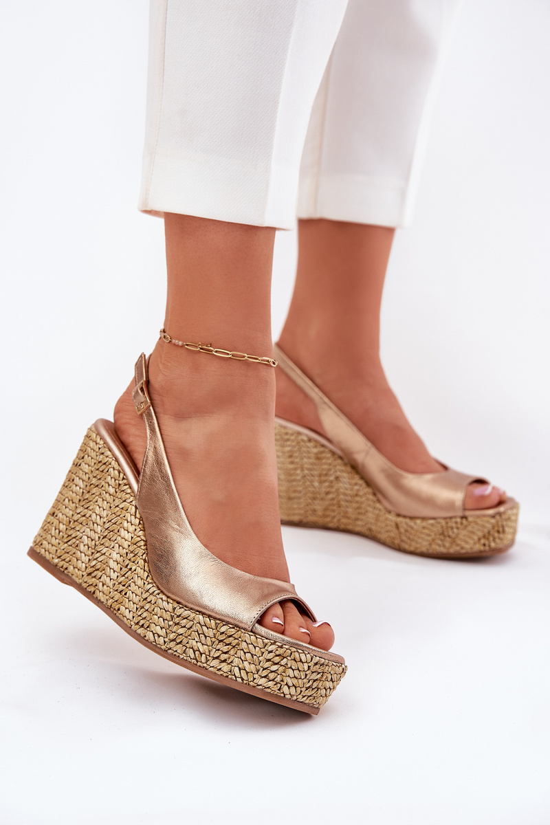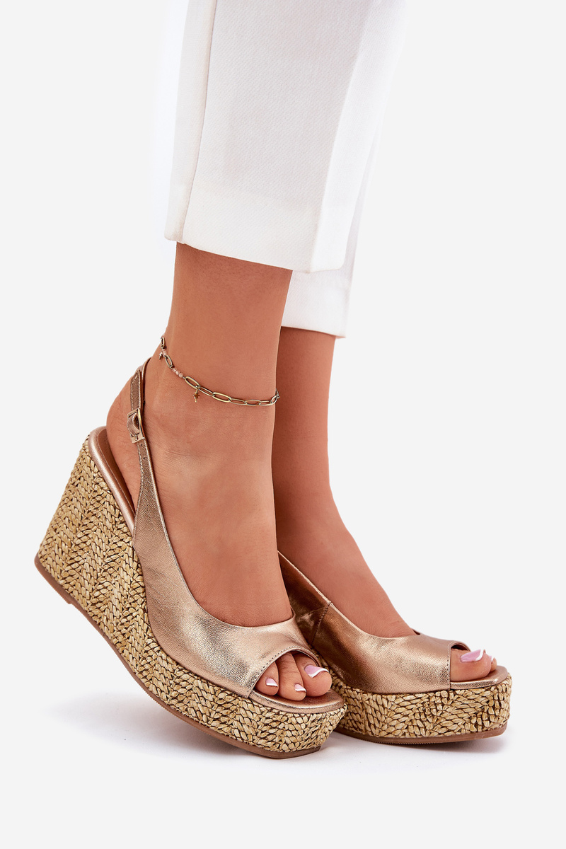 Skórzane Sandały Damskie Na Koturnie Z Plecionką Laura Messi 2789 Złote