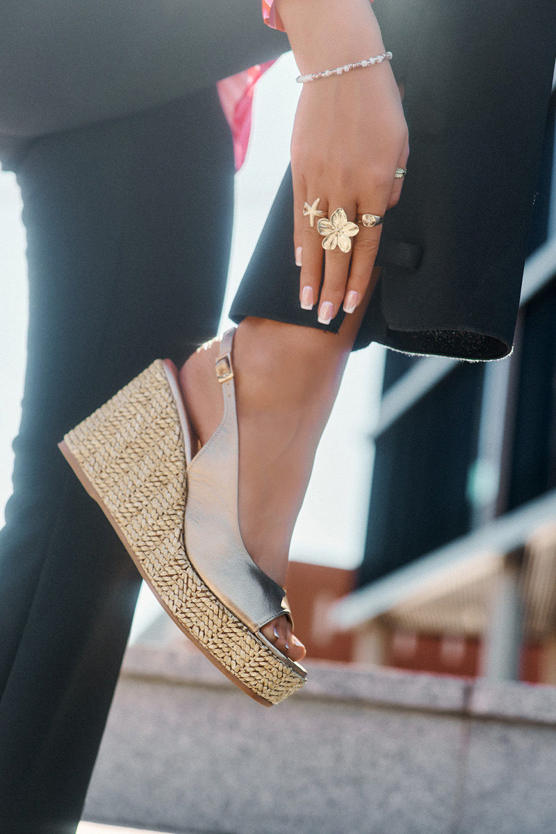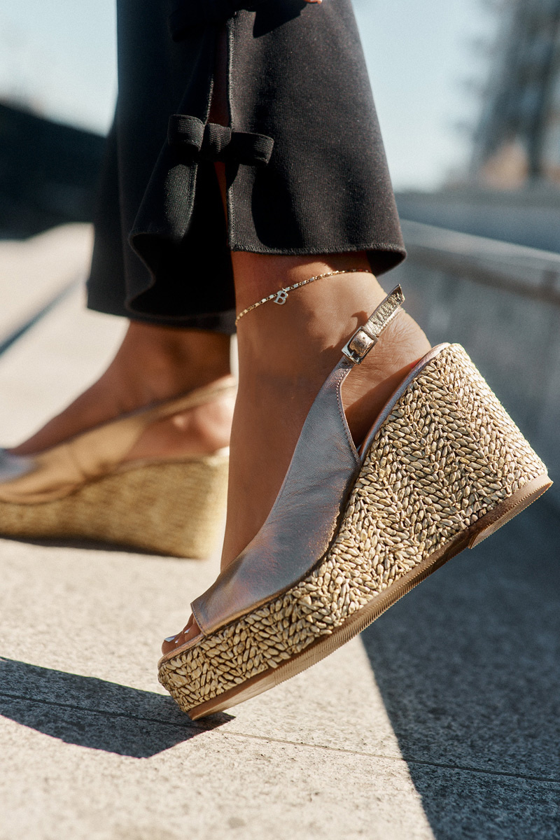 Damskie sandały wykonane z naturalnej skóry to elegancka propozycja na letnie dni. Osadzone na koturnie i platformie ozdobionej plecionką, łączą komfort z modnym wyglądem. Zapinane na sprzączkę z regulowanym paskiem, pozwalają na idealne dopasowanie do stopy, zapewniając wygodę przez cały dzień. Te sandały będą doskonałym wyborem do eleganckich i casualowych stylizacji, dodając im wyjątkowego charakteru. Przy wyborze rozmiaru prosimy kierować się tabelą rozmiarów.