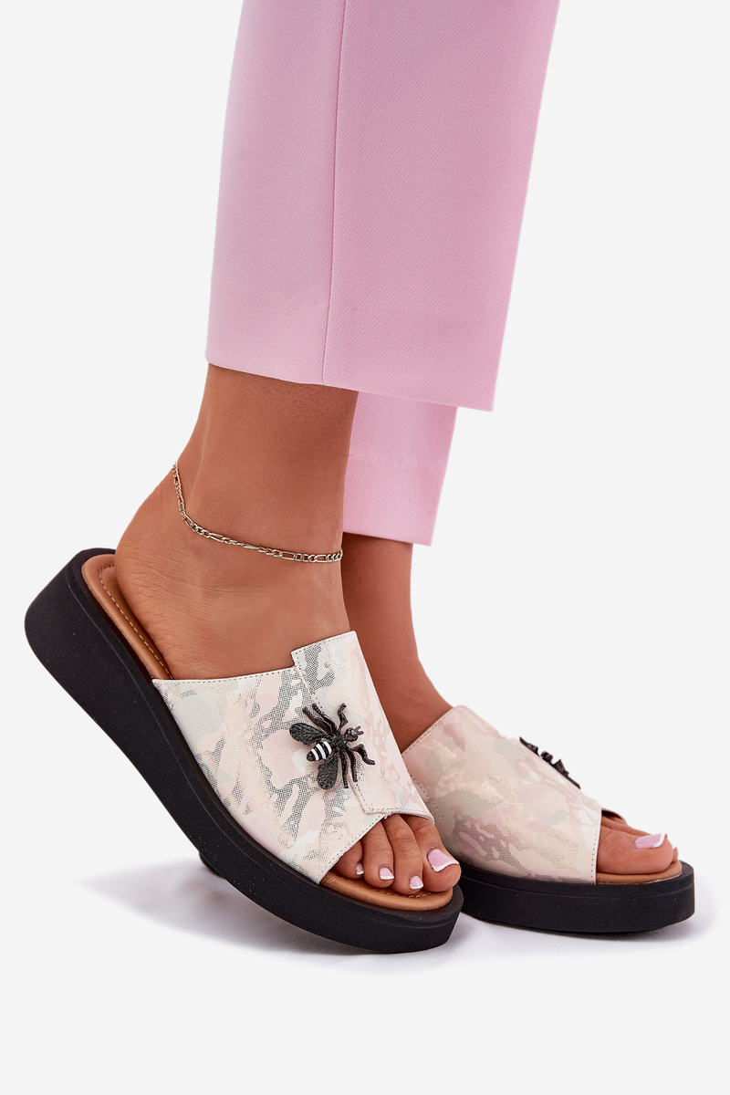 Skórzane Klapki Damskie Z Broszką Vinceza 66752 Beżowe