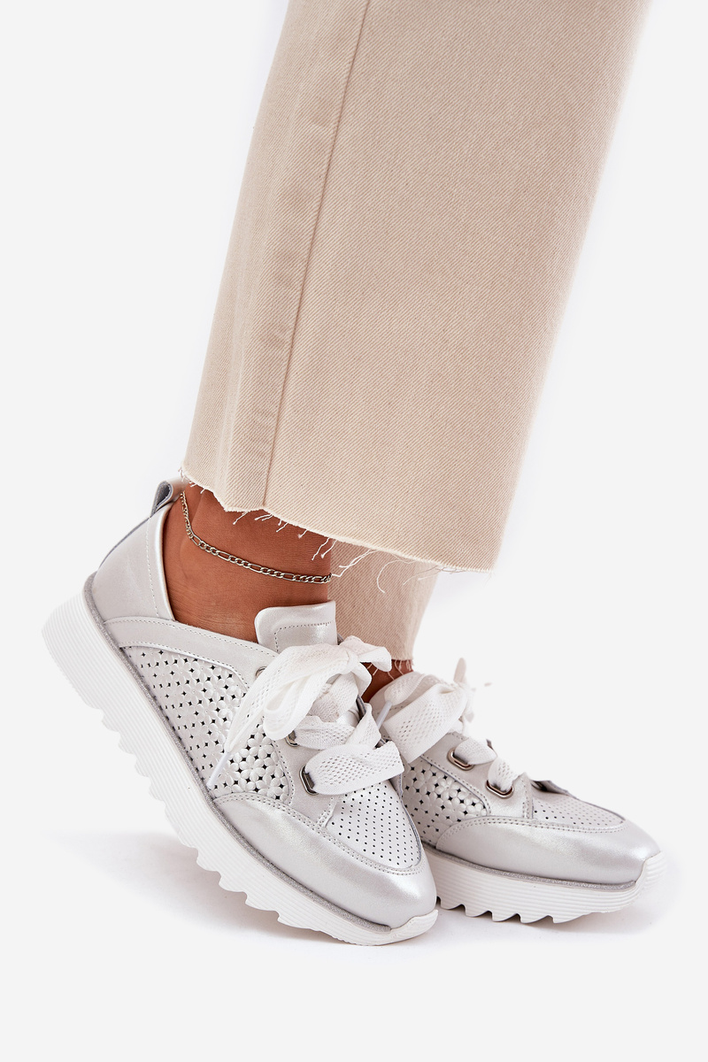 Skórzane Sneakersy Damskie Na Platformie D&A LR51-796 Srebrne