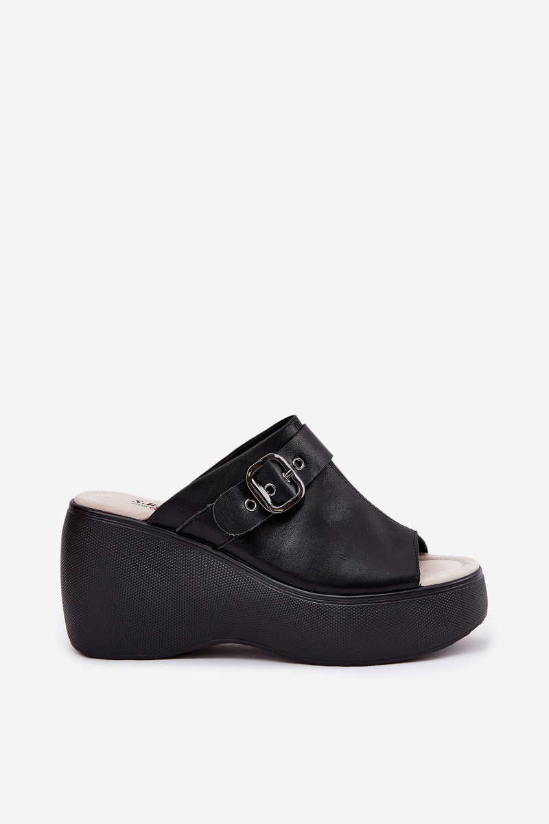 Skórzane Klapki Damskie Na Platformie I Koturnie Z Klamrą S.Barski LR51-542 Czarne
