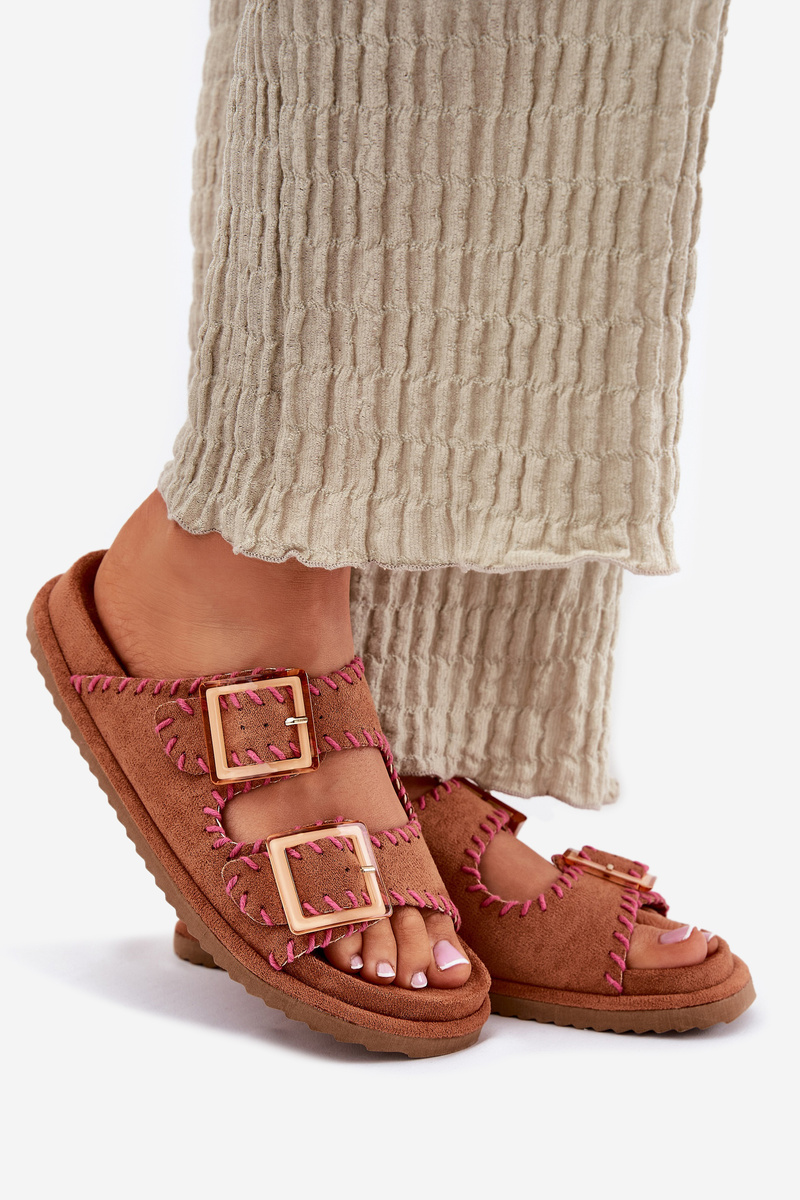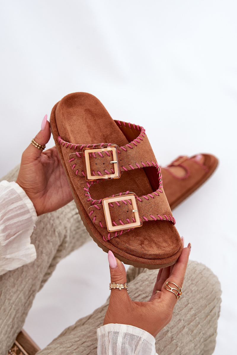 Klapki Damskie Z Klamrami I Ozdobnym Obszyciem Camel Visley