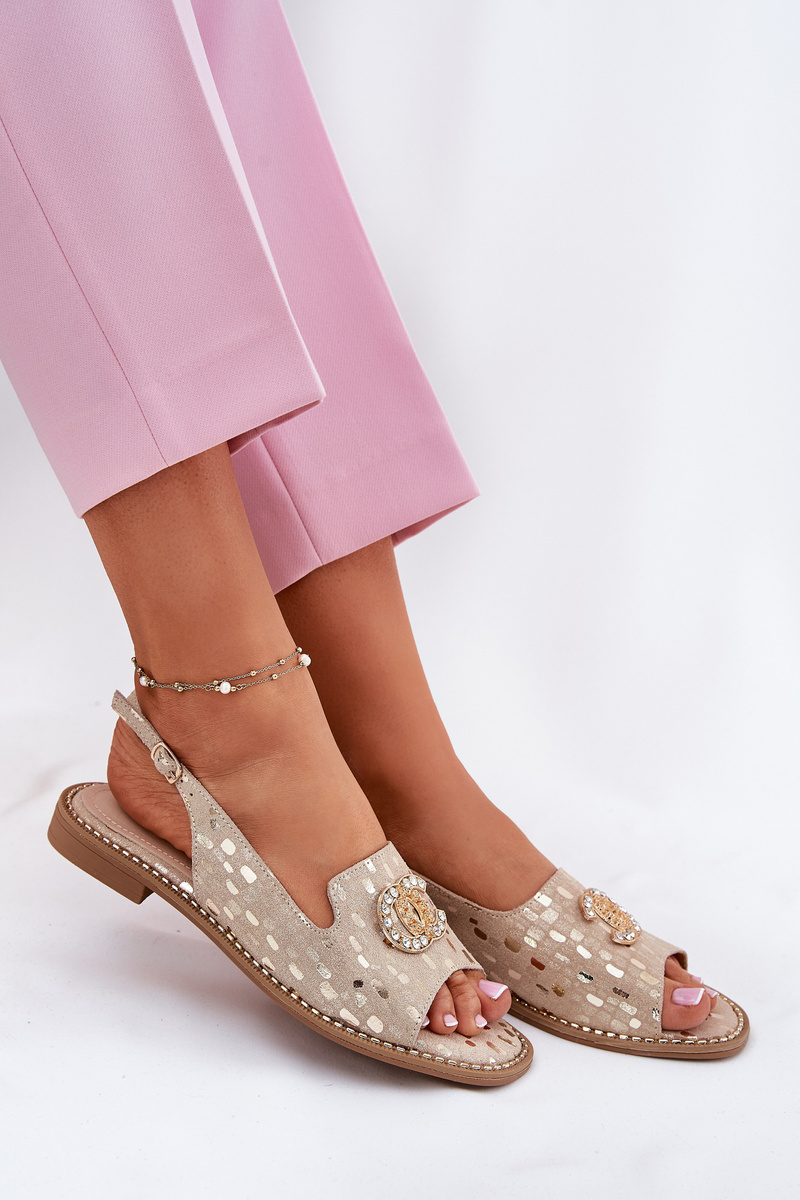 Skórzane Sandały Z Ozdobą Na Płaskim Obcasie S.Barski KV51-096 Złote