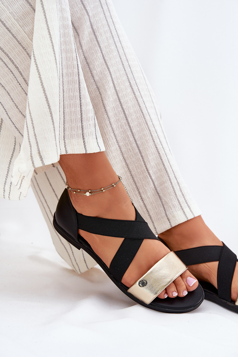 Sandały Damskie Płaskie Z Elastycznymi Paskami Czarno-Złote Marinea