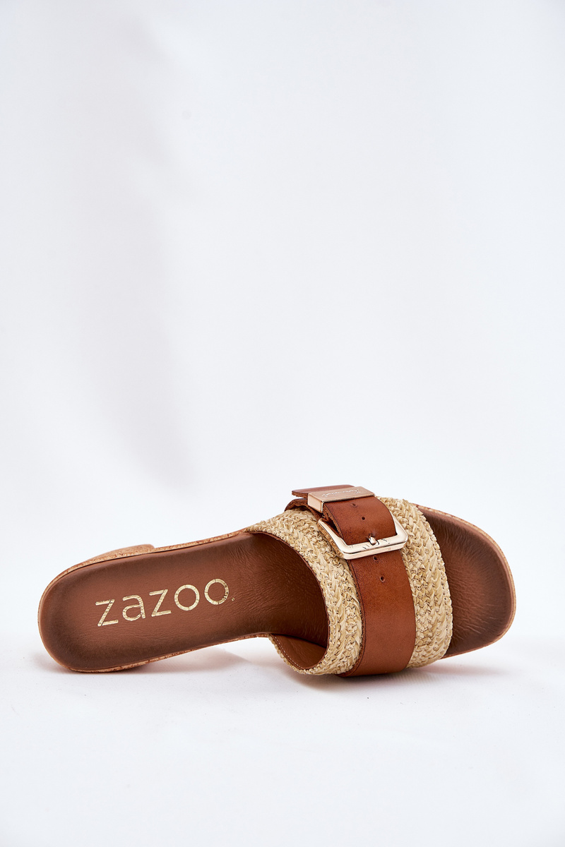 Skórzane Klapki Damskie Na Słupku Z Klamrą I Plecionką Zazoo 40459 Brązowe