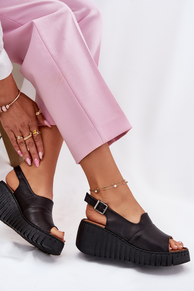 Sandały Damskie Z Naturalnej Skóry Na Koturnie Artiker 54C0791 Czarne