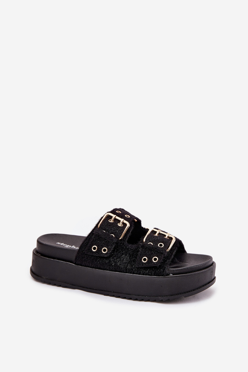 Klapki Damskie Ze Złotymi Klamrami Na Platformie Czarne Virvania