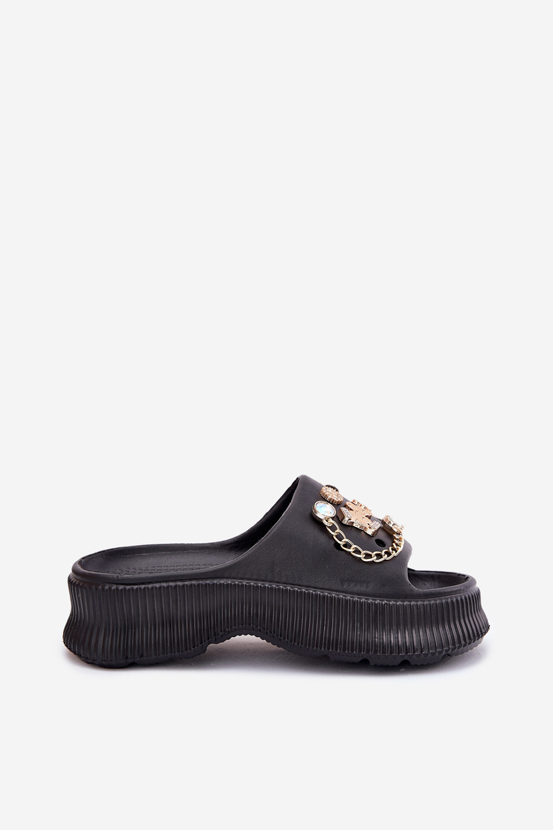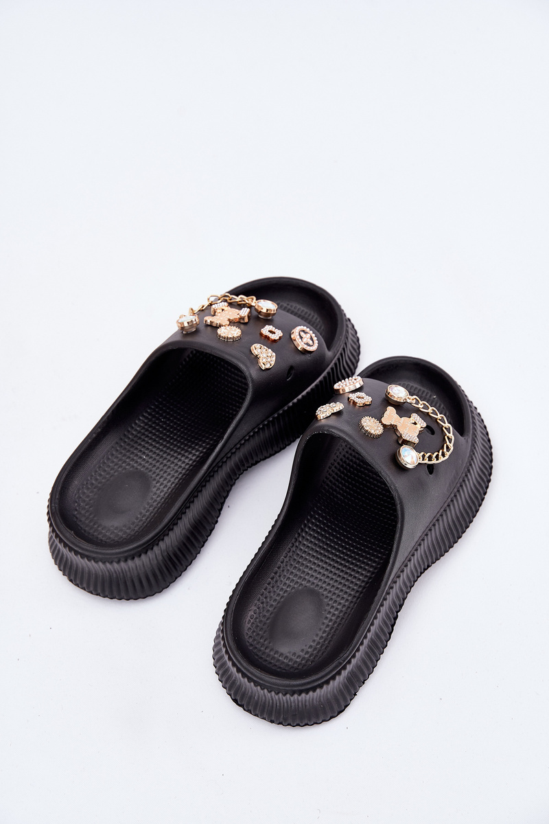Piankowe Klapki Damskie Ze Złotymi Przypinkami Czarne Hortiana