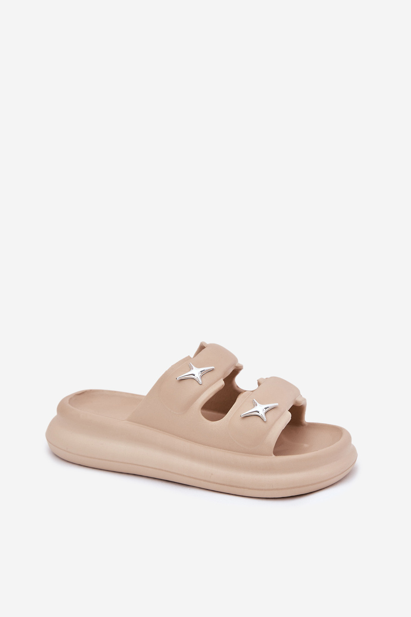 Klapki damskie z piankowego tworzywa, lekkie i osadzone na platformie, to doskonały wybór na ciepłe dni. Dwa paski ozdobione srebrnymi przypinkami dodają im modnego charakteru. Idealne na basen, codzienne wyjścia oraz wakacyjne wyjazdy. Przy wyborze rozmiaru prosimy sugerować się tabelą rozmiarów.