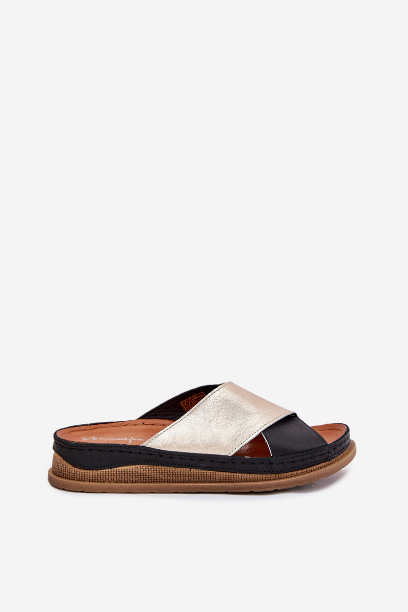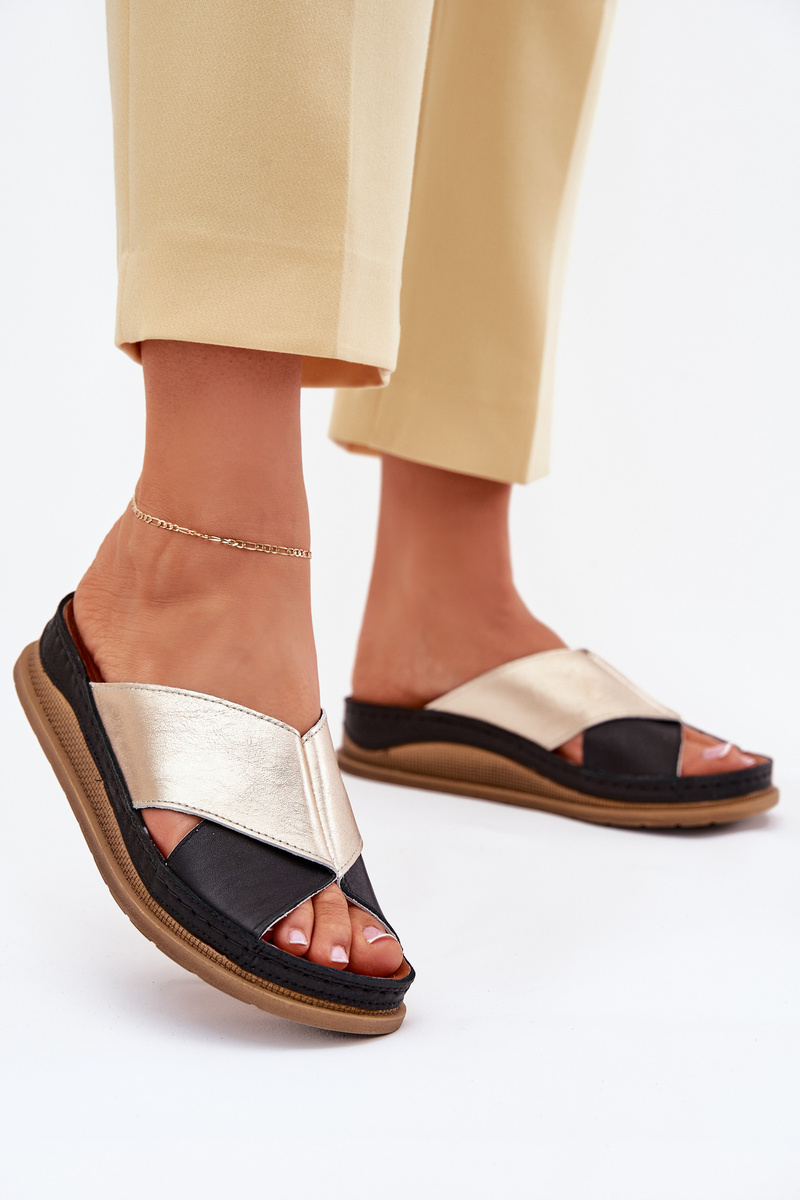 Skórzane Klapki Damskie Na Platformie Maciejka L4986-25 Złoto-Czarne