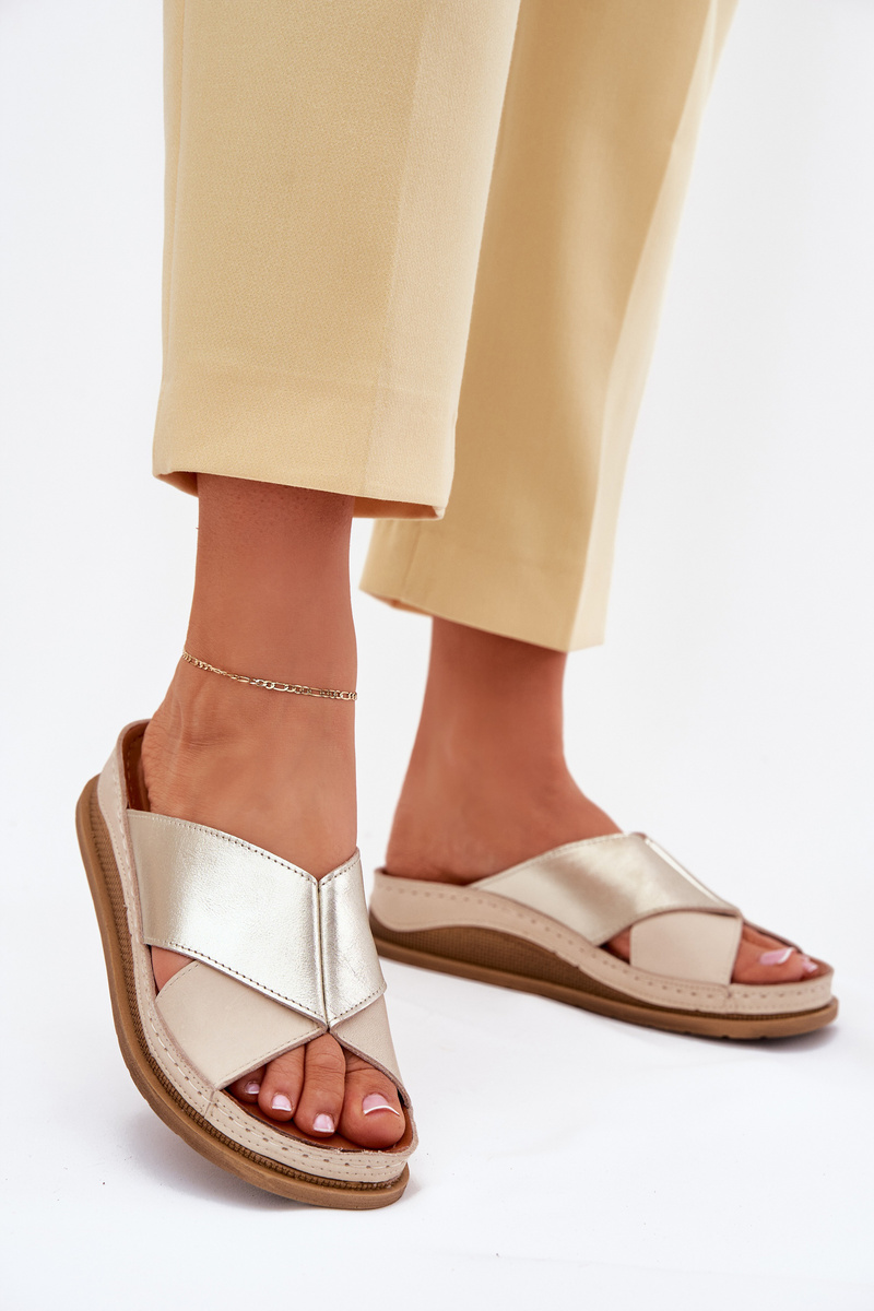 Skórzane Klapki Damskie Na Platformie Maciejka L4986-37 Beżowo-Złote