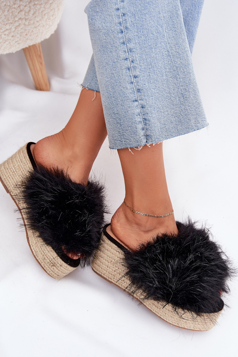 Klapki Damskie Na Koturnie Z Futerkiem I Plecionką Czarne Virela