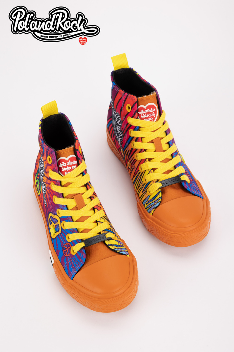 To najbardziej kolorowy i wyrazisty model z całej kolekcji, który został zaprojektowany przez zespół grafików Jurka Owsiaka. Trampki zachwycają żywą, intensywną kolorystyką odzwierciedlając energię i radość płynącą z muzyki i wspólnego świętowania. Niebieski kolor tworzy tło dla dynamicznych, wielobarwnych grafik. Na butach widnieje duży, biały napis Pol'and'Rock jednoznacznie wskazując na muzyczny charakter modelu. Żółte sznurowadła dodają wyrazistego kontrastu, a białe logo Big Star Shoes na boku podkreślają dbałość o detale.