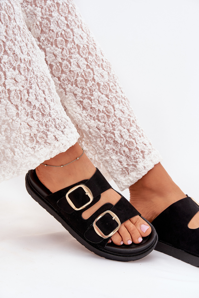 Klapki Damskie Na Platformie Ze Złotymi Klamrami Czarne Verena