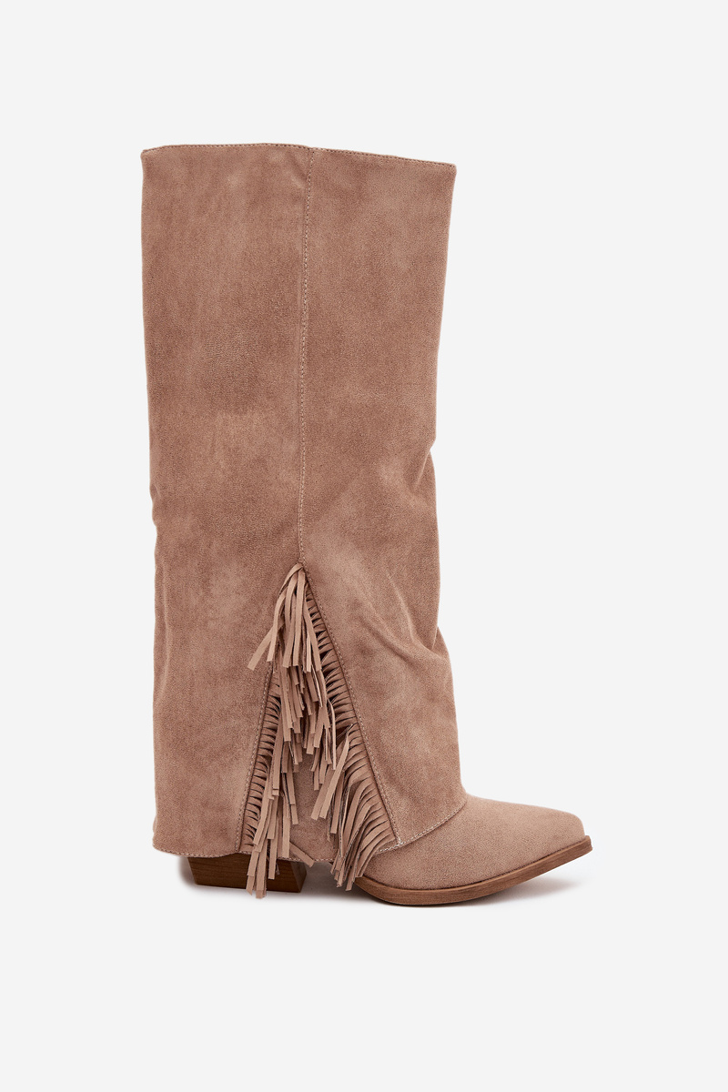 Wsuwane Kozaki Kowbojki Damskie Na Słupku Z Frędzlami Beżowe Zalia
