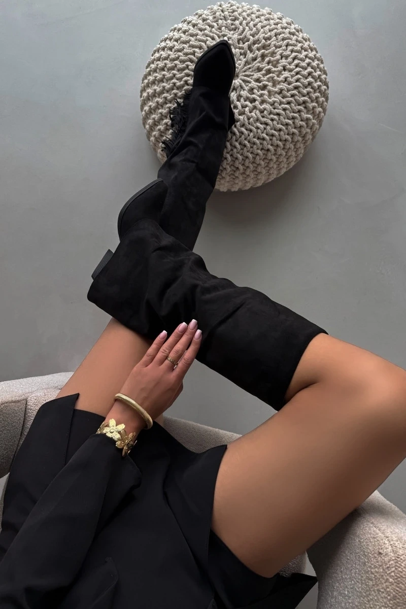 Wsuwane kozaki kowbojki z eko zamszu, osadzone na obcasie słupku, to połączenie wygody i stylu. Szpiczaste noski dodają elegancji, a cholewka ozdobiona frędzlami wprowadza lekki, boho akcent. Idealne do casualowych stylizacji, świetnie komponują się z sukienkami, spódnicami i spodniami, nadając każdej kreacji odrobinę kowbojskiego uroku. Przy wyborze rozmiaru prosimy sugerować się tabelą rozmiarów.