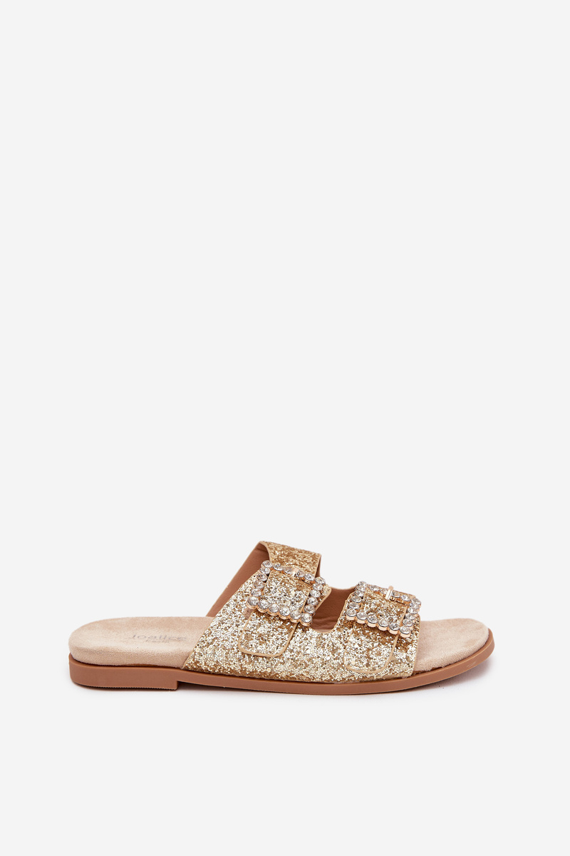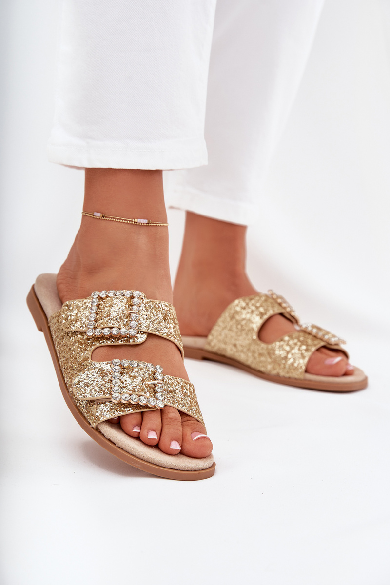 Błyszczące Zdobione Klapki Z Klamrami Na Płaskim Obcasie Złote Tovira