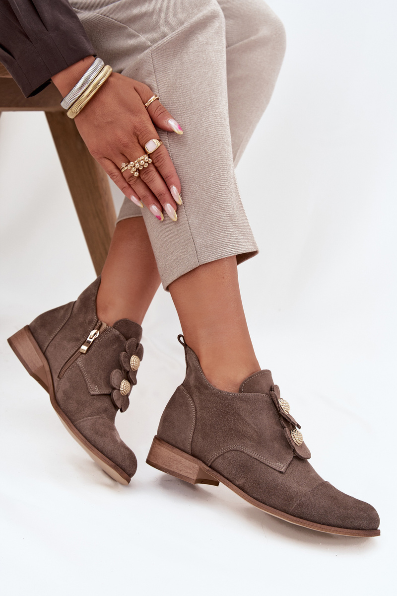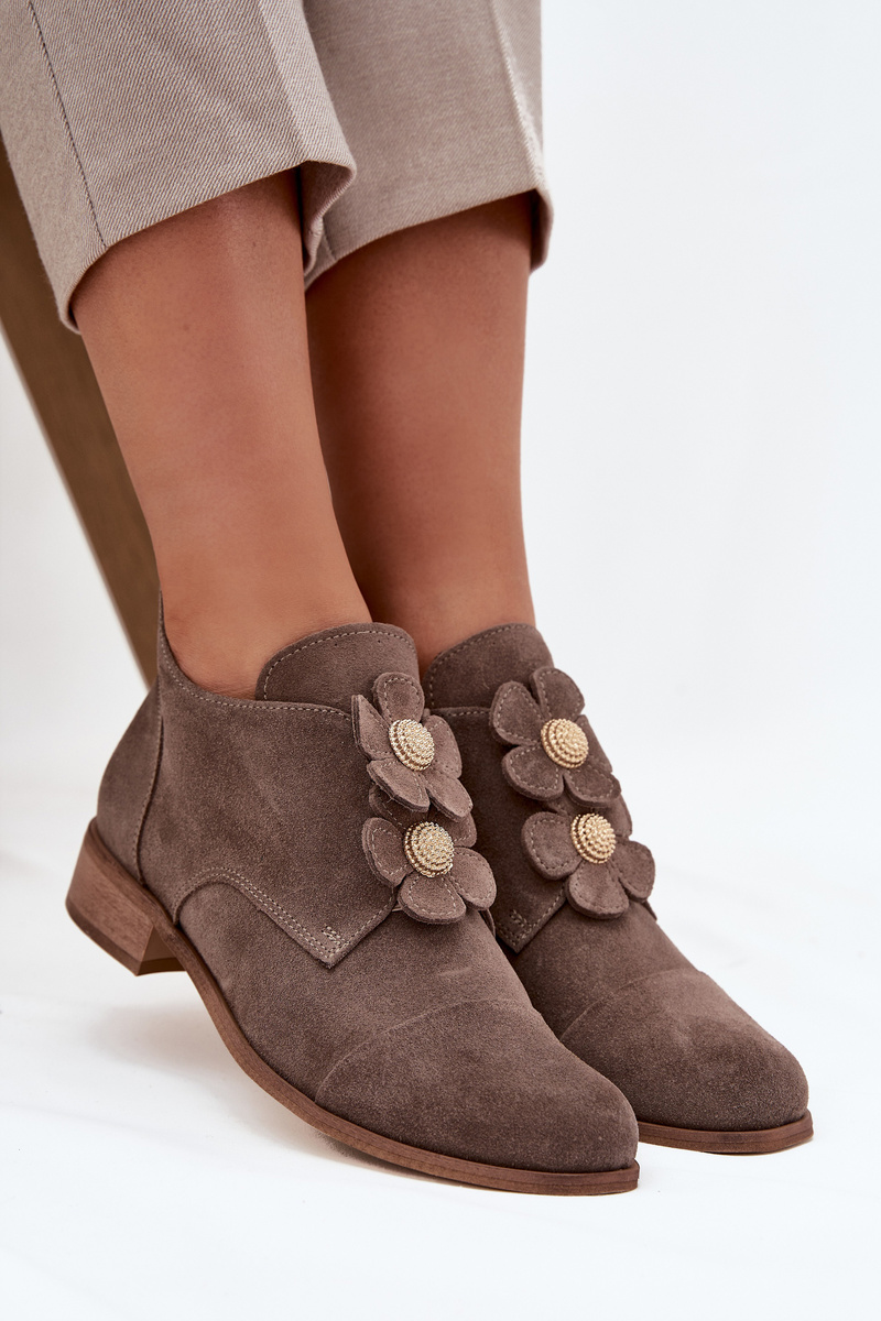 Zamszowe Półbuty Damskie Z Ozdobnymi Kwiatkami Zazoo 3080 Ciemnobeżowe