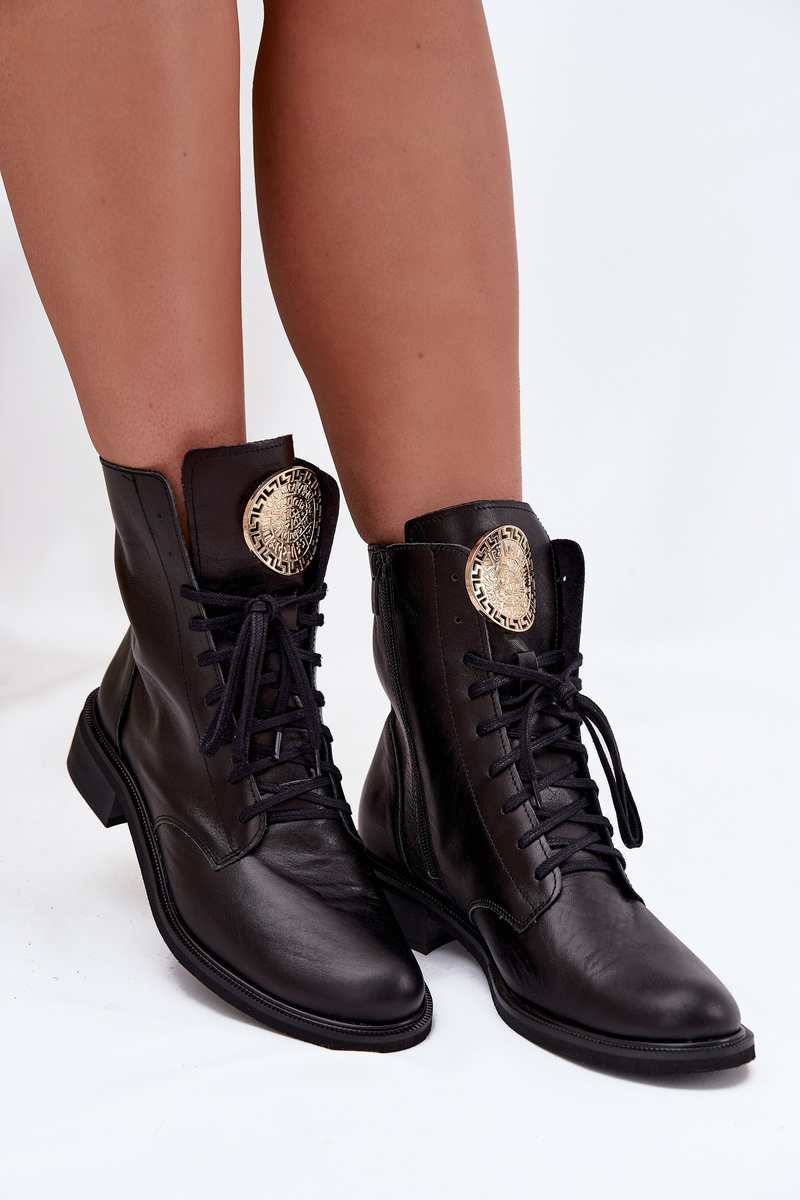 Skórzane Botki Damskie Na Płaskim Obcasie Ze Złotym Detalem Zazoo 3084 Czarne