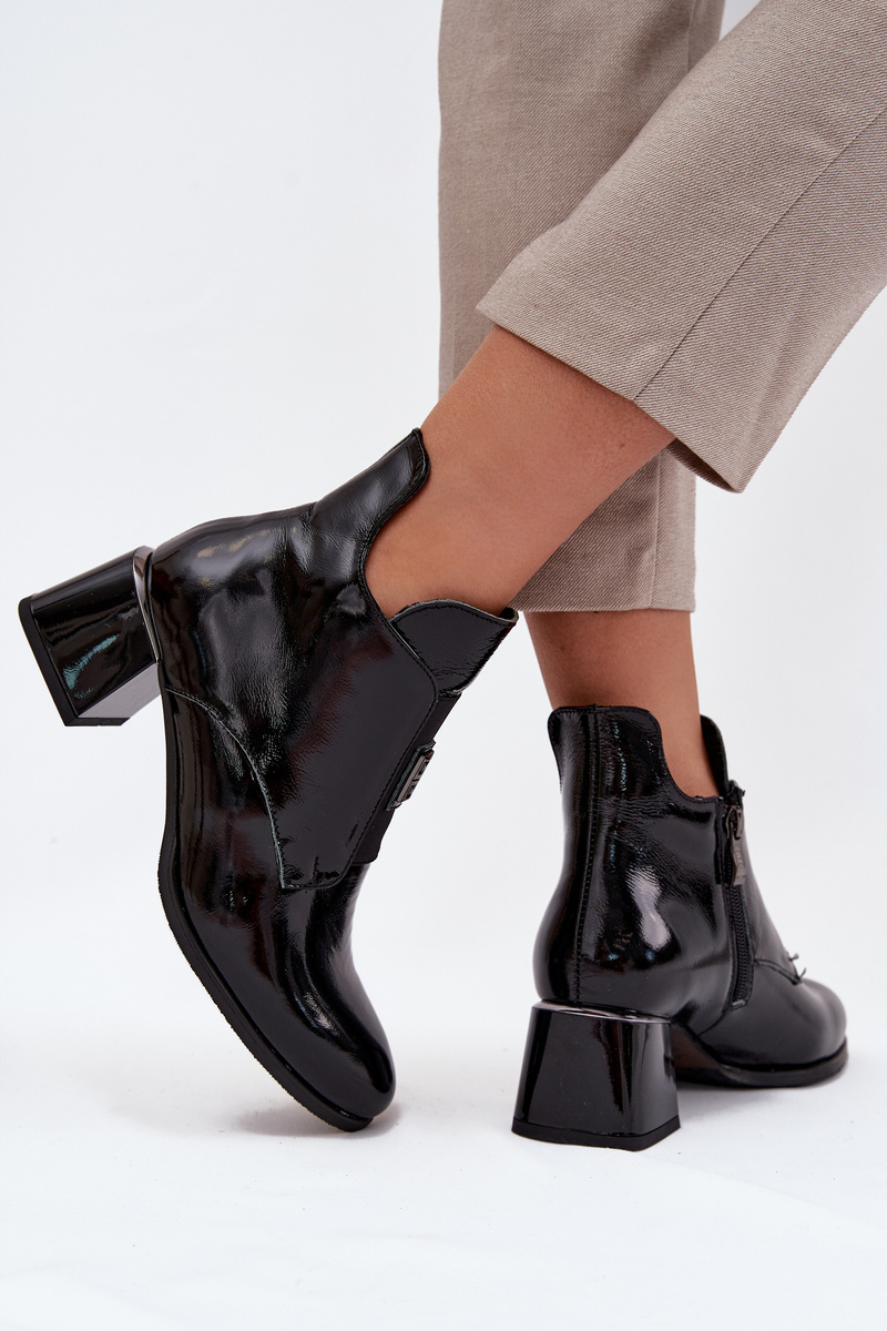 Skórzane Lakierowane Botki Na Klocku Z Ozdobnym Detalem Ocieplane Zazoo 60560 Czarne