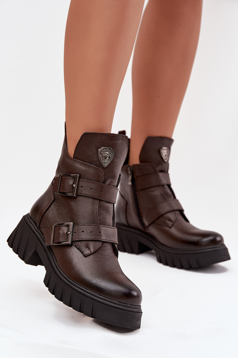 Skórzane Ocieplane Botki Damskie Z Klamrami I Ozdobnym Detalem Zazoo 60482 Czekoladowe