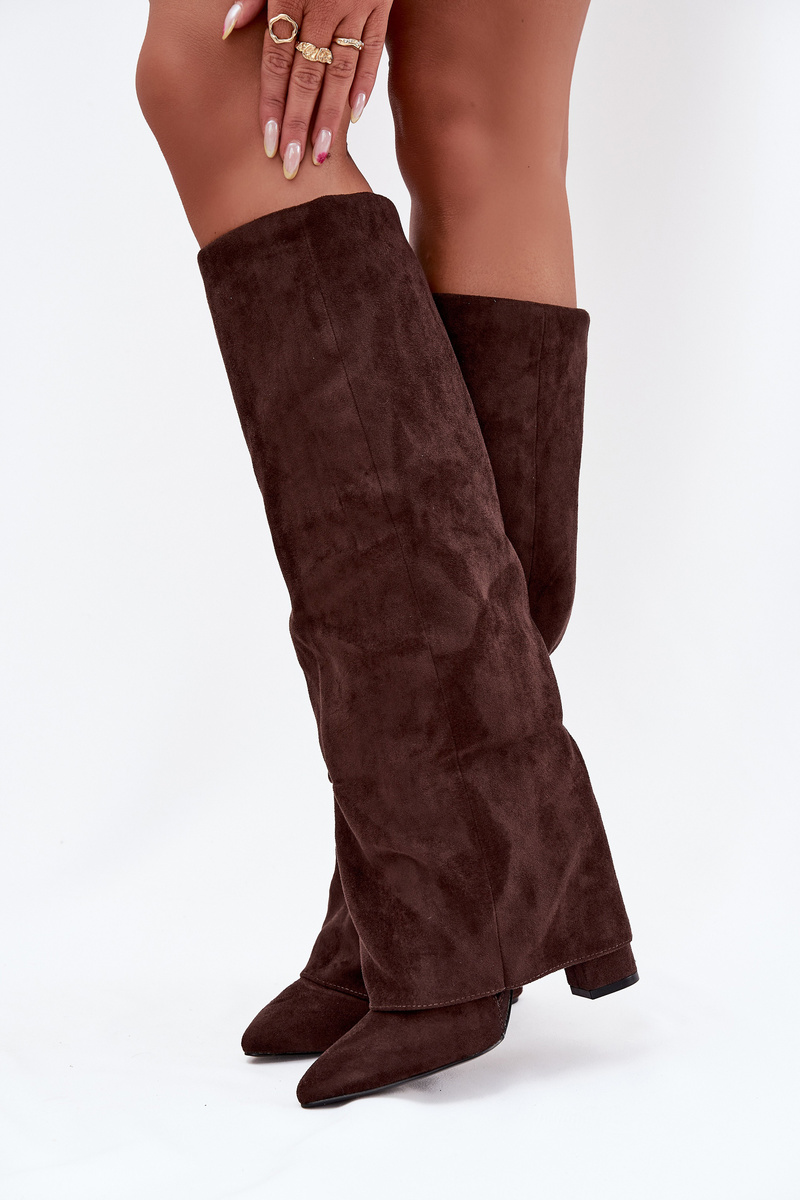 Ocieplane Kozaki Damskie Z Wywiniętą Cholewką Na Słupku Eko Zamszowe Czekoladowe Elivira