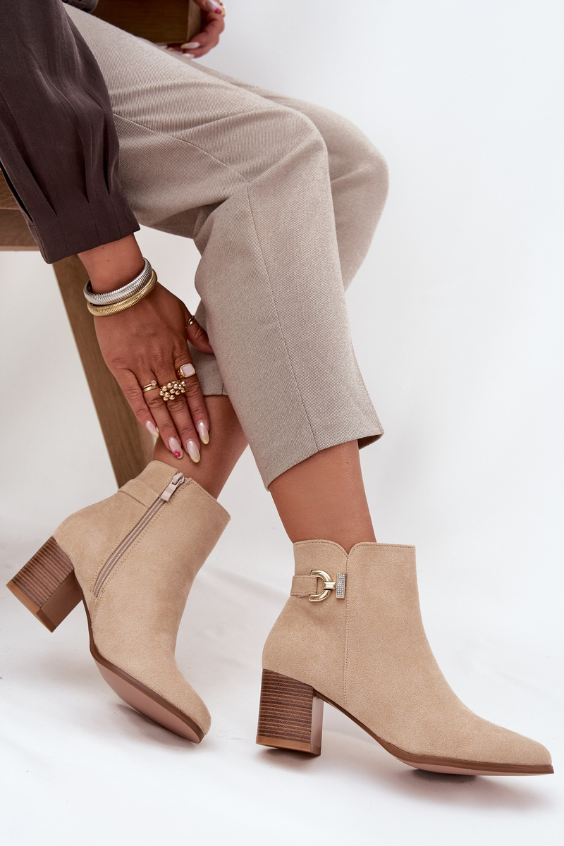 Ocieplane Botki Damskie Na Słupku Ze Złotym Detalem Beżowe Renora