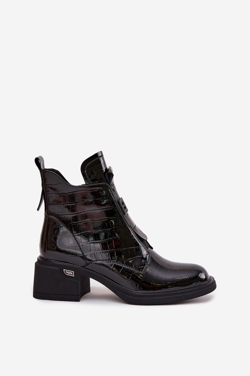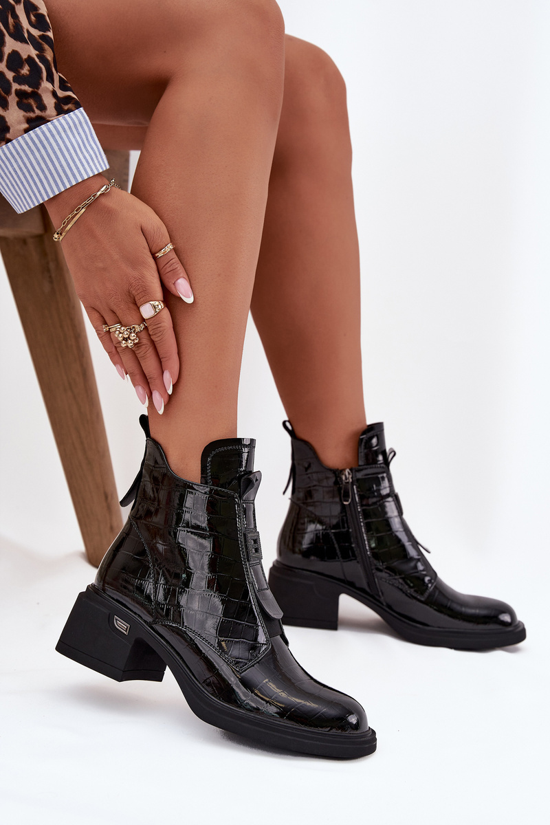 Lakierowane Skórzane Botki Damskie Z Tłoczeniem Na Klocku Czarne Lorenza