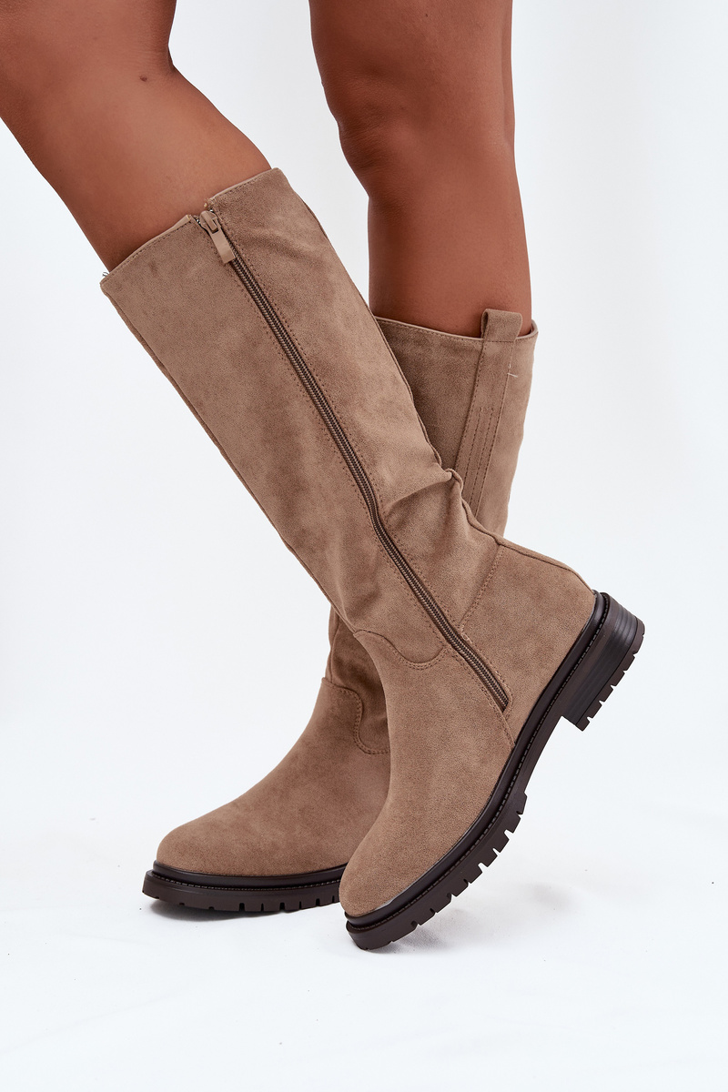 Kozaki Damskie Ocieplane Na płaskim Obcasie Eko Zamszowe Ciemnobeżowe Delyssa