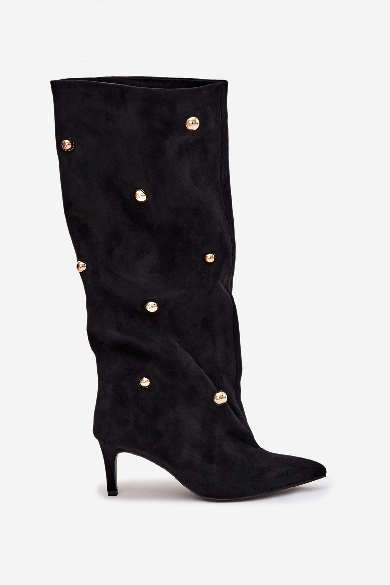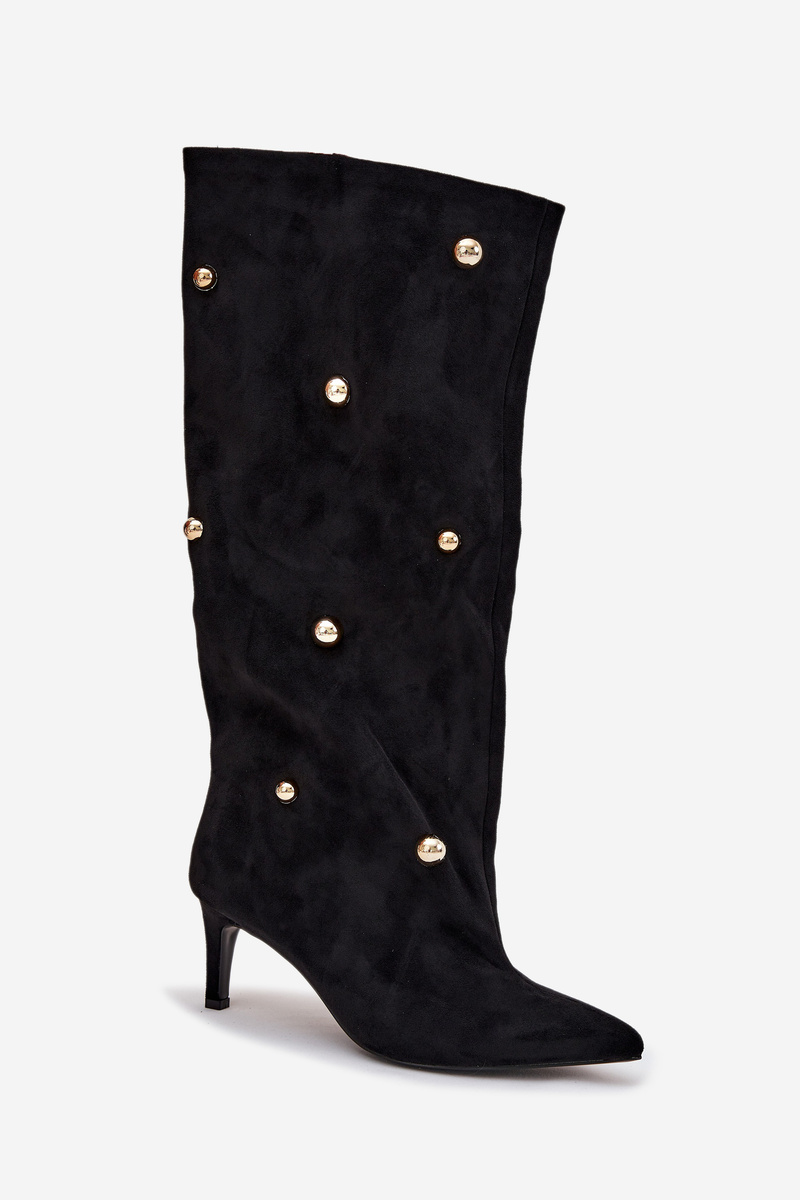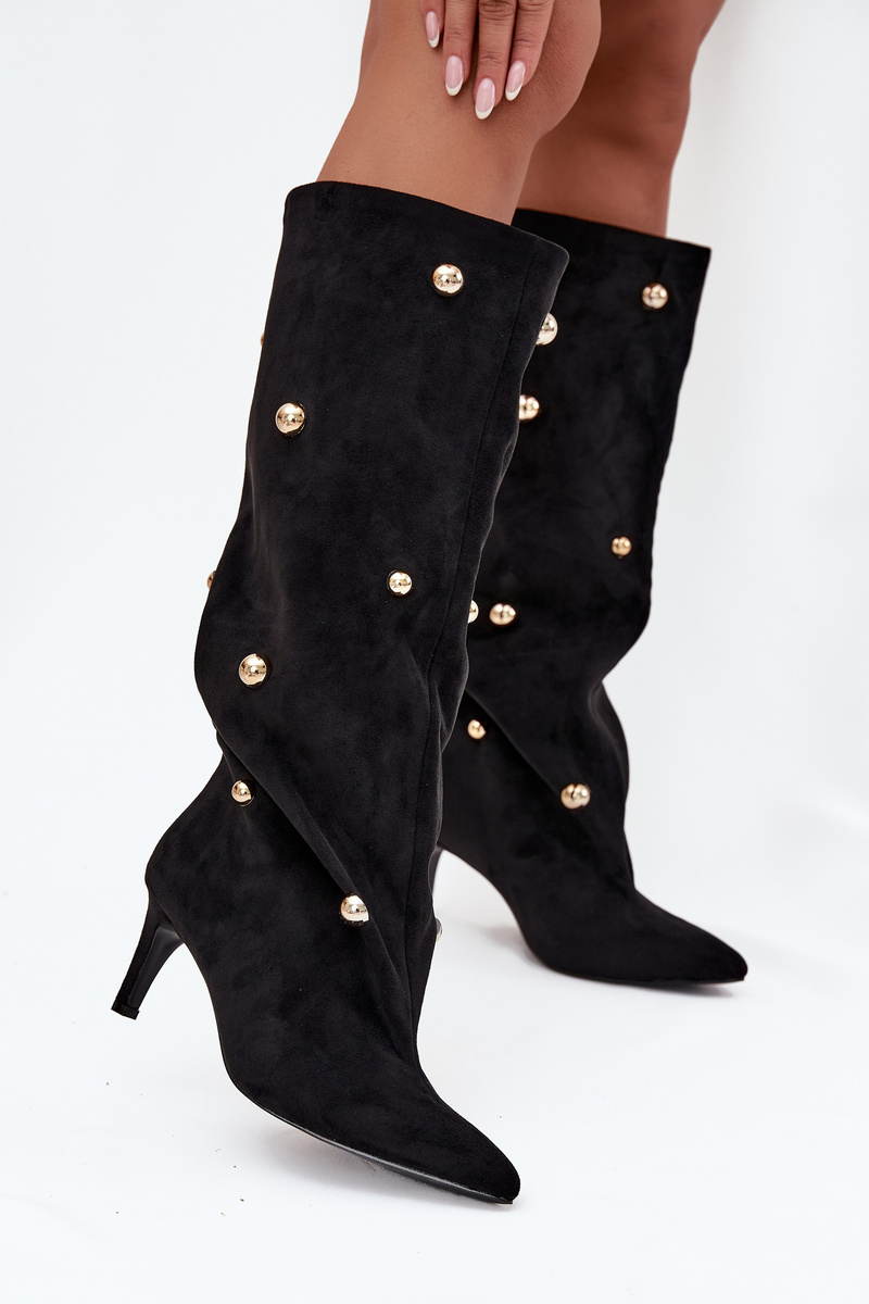 Wsuwane Kozaki Damskie Na Szpilce Ze Złotymi Ozdobami Czarne Thaliane