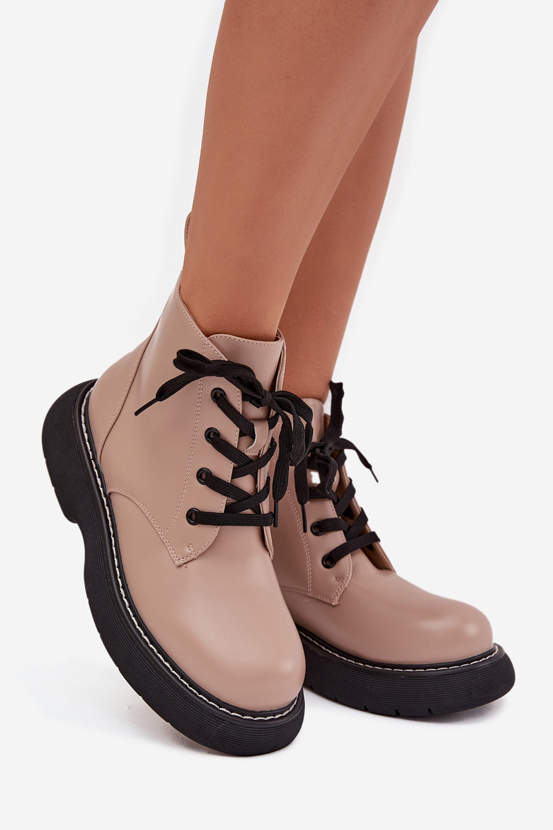 Ocieplane Botki Damskie Na Platformie Sznurowane Ciemnobeżowe Harmine