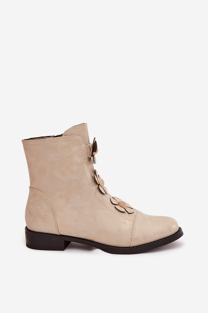 Ocieplane Botki Damskie Na Płaskim Obcasie Z Ozdobnymi Kwiatkami Złote Pravienne