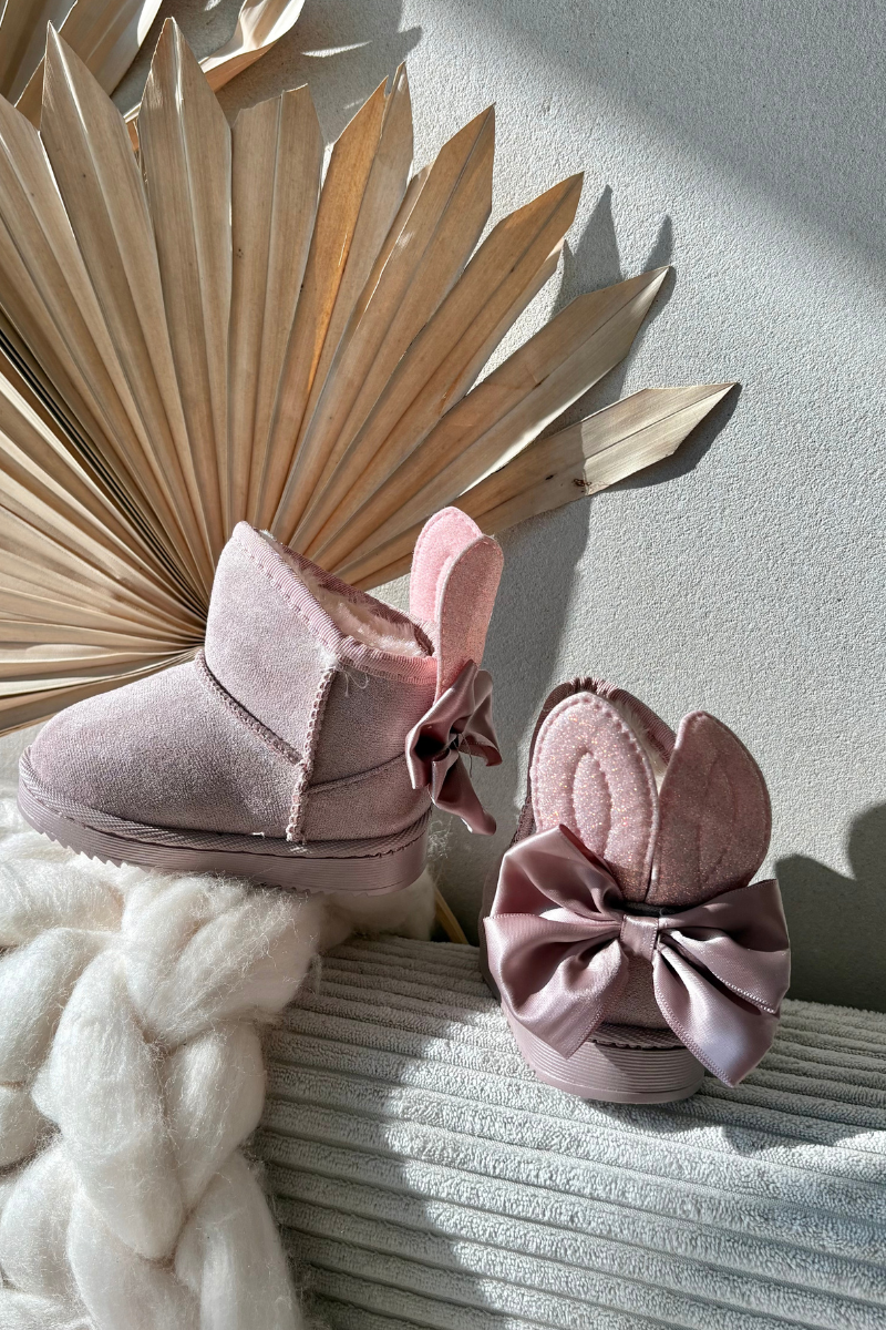Podczas chłodnych dni warto zadbać o wygodne obuwie. Idealnym wyborem do zimowych zabaw będą urocze śniegowce na delikatnej platformie. Grube ocieplenie w postaci miękkiego futerka przyjemnie otuli stopy Twojej pociechy. Duża kokarda oraz błyszczące uszy z tyłu nadają całości niezwykle dziewczęcy charakter. Twoje dziecko będzie zachwycone tym modelem! Przy wyborze rozmiaru prosimy kierować tabelą rozmiarów.