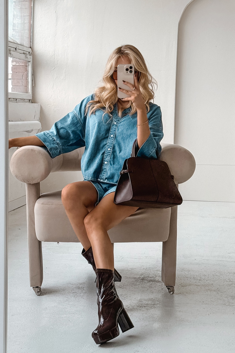 Lakierowane Botki Damskie Na Platformie I Słupkowym Obcasie Czekoladowe Calvessa