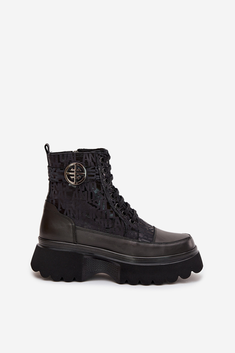 Skórzane Botki Damskie Na Platformie Z Napisami I Ozdobnym Detalem Artiker 57C2273 Czarne