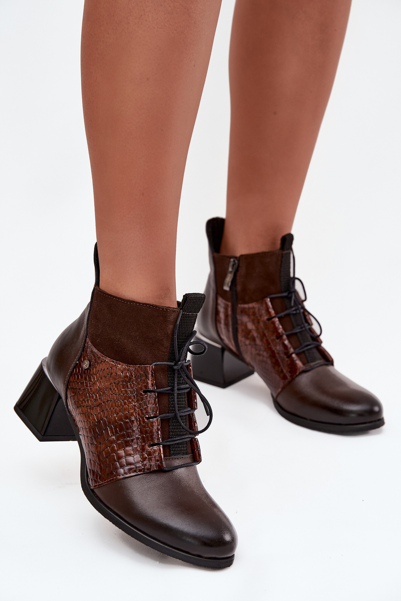 Zazoo 60503 Skórzane Botki Na Obcasie Ocieplane Czekoladowe