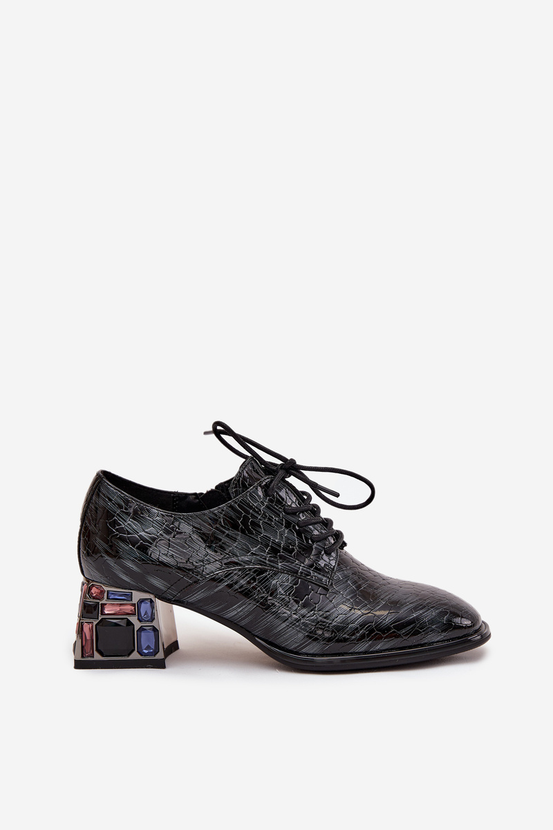 Skórzane Lakierowane Półbuty Damskie Na Obcasie Z Kryształkami Artiker 57C0072 Szare