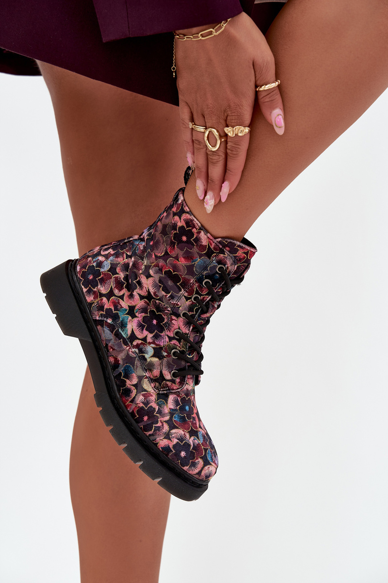 Botki damskie marki Artiker to propozycja, która przyciąga wzrok i podkreśla indywidualny styl. Osadzone na płaskim obcasie, gwarantują wygodę i stabilność podczas codziennego noszenia. Model łączy w sobie praktyczne sznurowanie oraz boczny zamek, dzięki czemu buty łatwo zakłada się i dopasowuje do stopy. Wnętrze zostało ocieplone, co zapewnia komfort i ciepło w chłodniejsze dni. Największym atutem tego modelu jest cholewka zdobiona licznymi, kolorowymi kwiatami, które nadają obuwiu wyjątkowego charakteru i sprawiają, że wyróżnia się na tle klasycznych fasonów. To botki, które doskonale sprawdzą się zarówno w casualowych stylizacjach, jak i jako oryginalny akcent w bardziej odważnych zestawach.  Przy wyborze rozmiaru prosimy sugerować się tabelą rozmiarów.