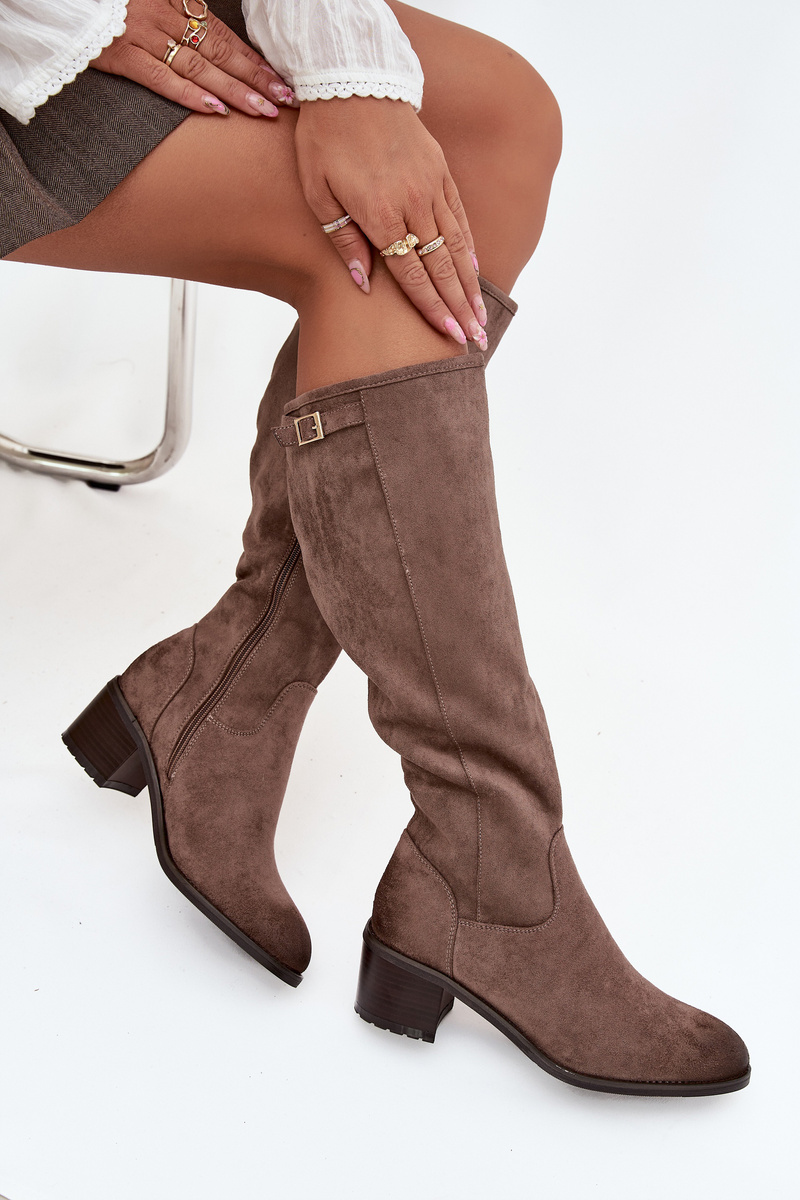 Kozaki Damskie Ocieplane Na Obcasie Ze Złotą Klamrą Vinceza 58589 Ciemnobeżowe